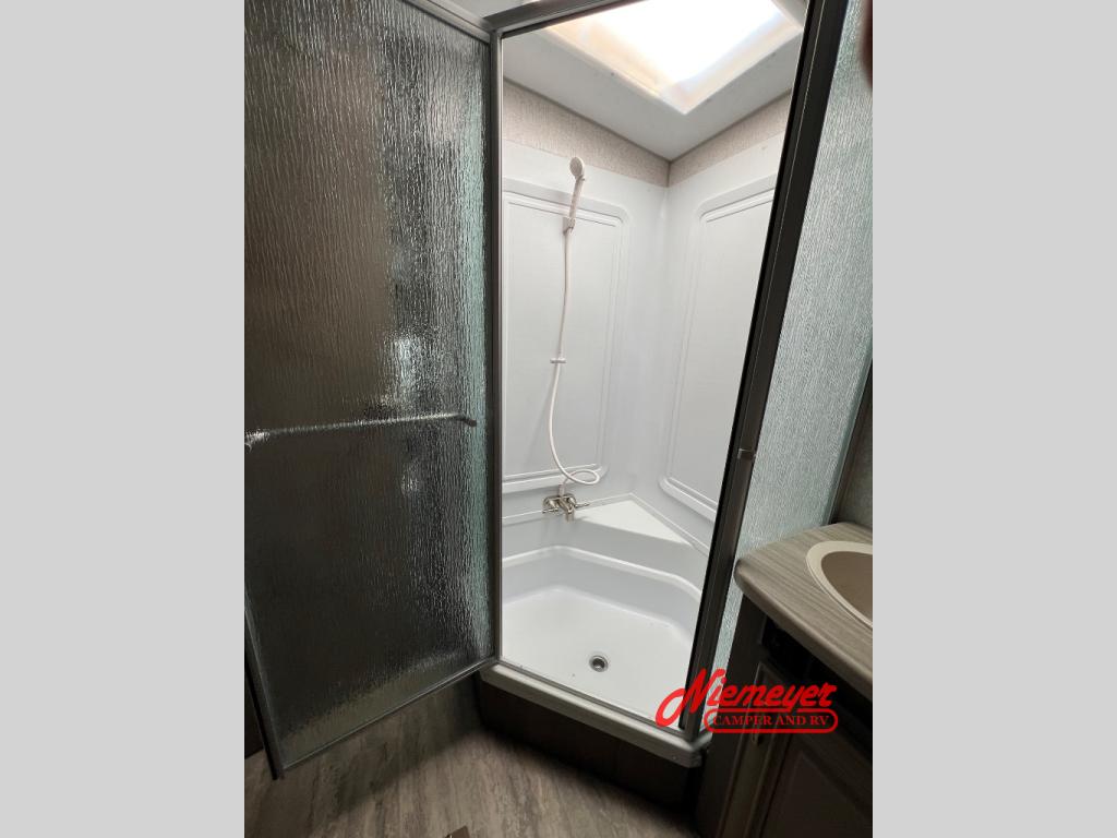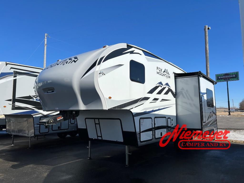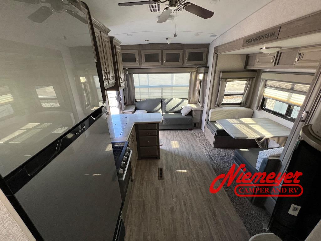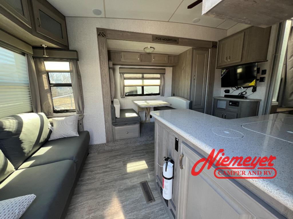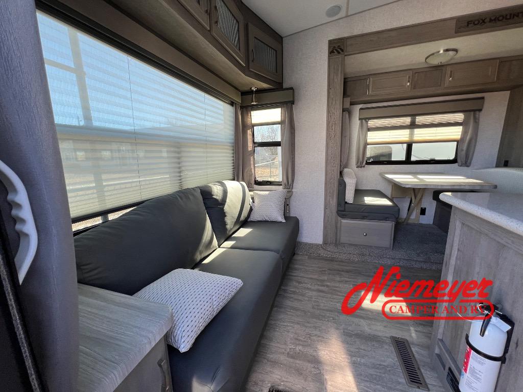 Get out and explore the best places to see with this Fox Mountain! Once you have arrived at the perfect spot, setup the 15' Carefree Travel'R 12V LED awning with adjustable pitch, and the slide out which includes the booth dinette and pantry. You can convert the dinette to a 40" x 72" sleeping area if needed for overnight guests after dining or playing games. Relax on the rear jackknife sofa with decorative pillows and two end tables to set your cellphone and beverages on or whip up a meal in the kitchen with an L-shaped counter top. The split bathroom includes a shower and sink along one side, a private toilet on the other, and a curtain to close for privacy that leads you into the front bedroom where you can sleep on the NW TruRest queen mattress, and there is a nightstand and wardrobe for your belongings.