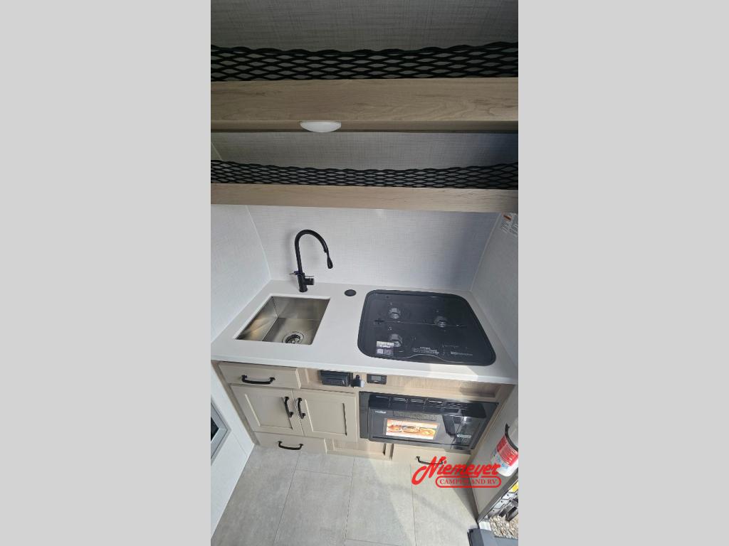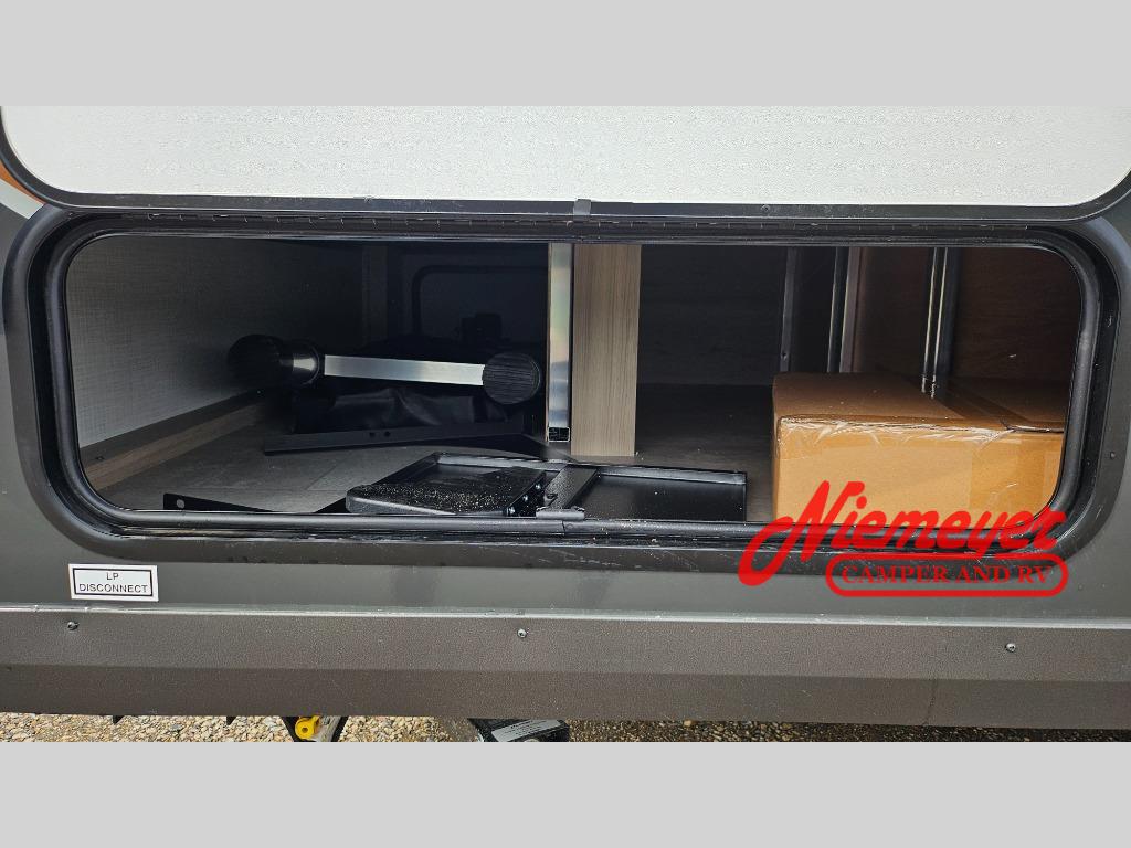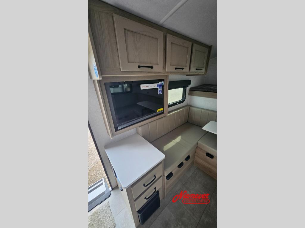 Whether you enjoy weekend trips to the woods or camping long term at the lake, this travel trailer will be perfect for your crew. There is a U-shaped dinette that can convert to sleeping space, plus a 26" x 74" bunk for an additional guest or two. You can prepare meals each day on the recessed cooktop or in the gas oven, and there is a 12V refrigerator for perishables. This model also includes an outside griddle, a 2" receiver hitch, plus a pass-through storage for fishing gear!