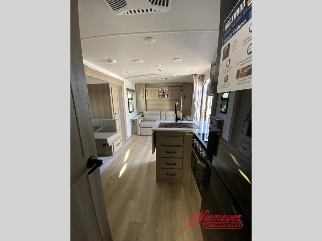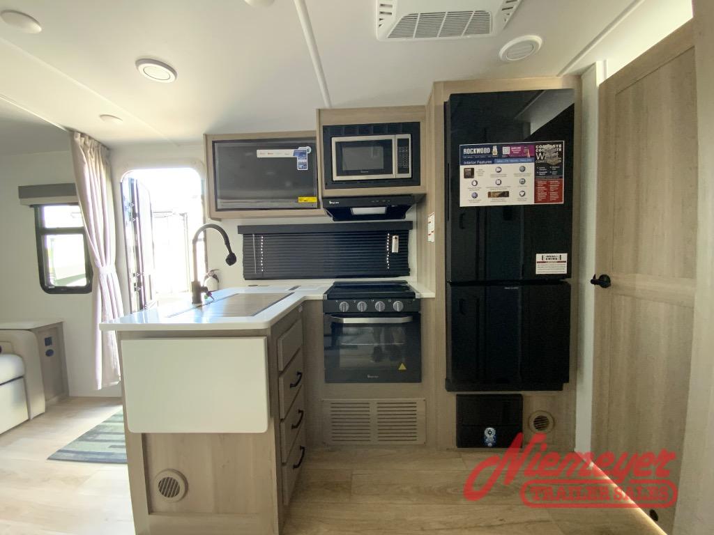 Each Rockwood Mini Lite travel trailer by Forest River is constructed with a fully laminated one-piece walkable roof, sleek frameless windows, and a six-sided full aluminum frame for strength and durability. The 12V thermostatically controlled heated tanks, plus radiant foil in the underbelly and slide out floors will allow you to camp well into the colder months, and the 200W roof solar panel will be perfect for a little off-gridding. Each model includes solid surface kitchen countertops, solid wood cabinet doors, night roller shades, plus many more interior features. Having an AIR 360+ omnidirectional antenna with WiFi prep on board gives you the option to get some work done if it's needed, and the power tongue jack provides hassle-free set up, so you can enjoy more time relaxing!
