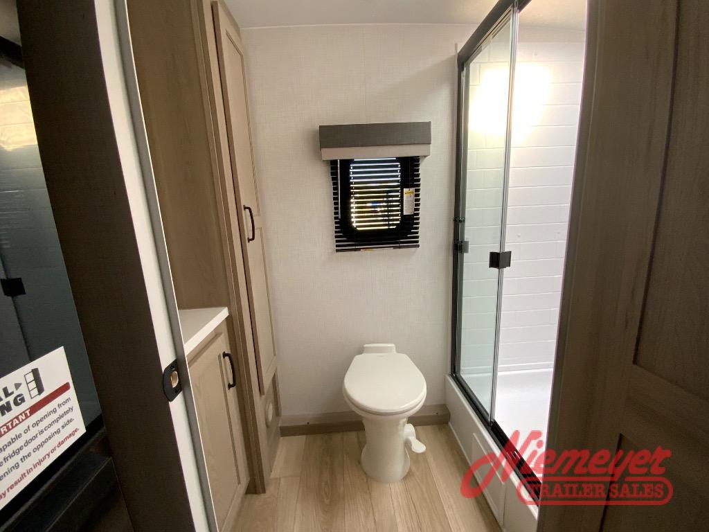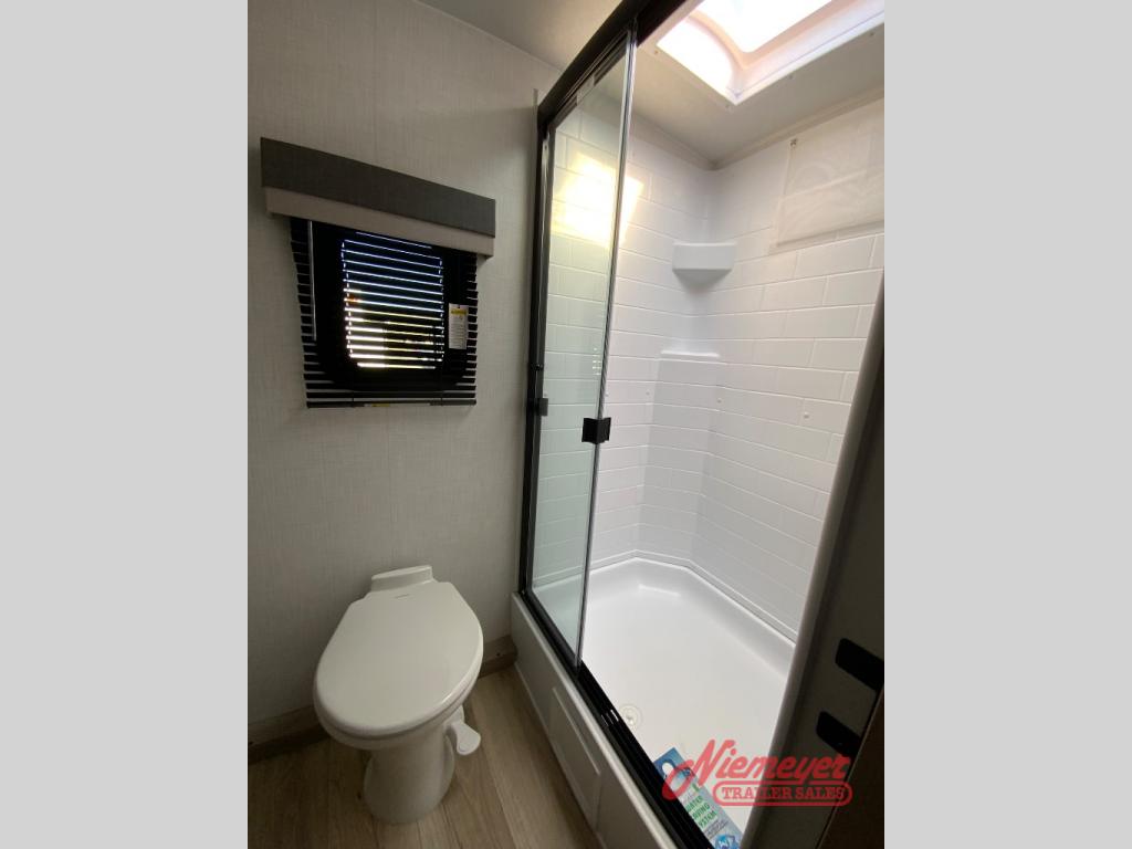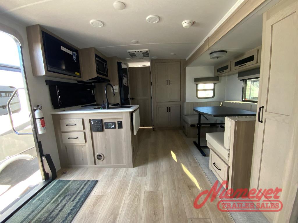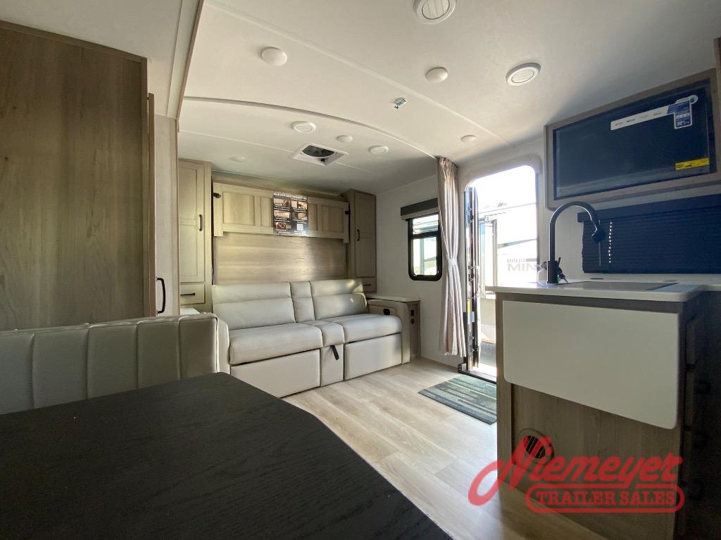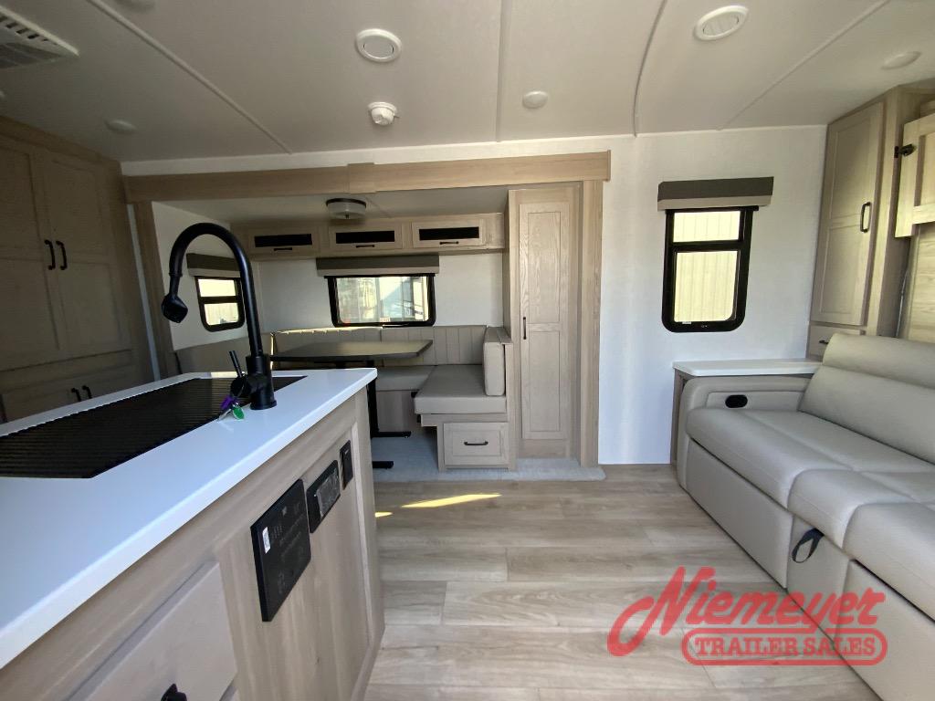 This versatile and cozy travel trailer will be perfect for weekend trips to the lake. Once you arrive at your campground, you can unload the water toys from the pass-thru storage, put out the 15' power awning, then make lunch on the exterior griddle. The U-shaped dinette slide inside will provide a place to dine, play board games, and let a guest or two sleep over, while you take the RV queen-size Murphy bed up front. In the morning, just fold up the bed to expose the 74" sofa! There is a three burner cooktop and microwave oven in the kitchen to make meals each day, along with a 12V refrigerator to keep leftovers fresh.