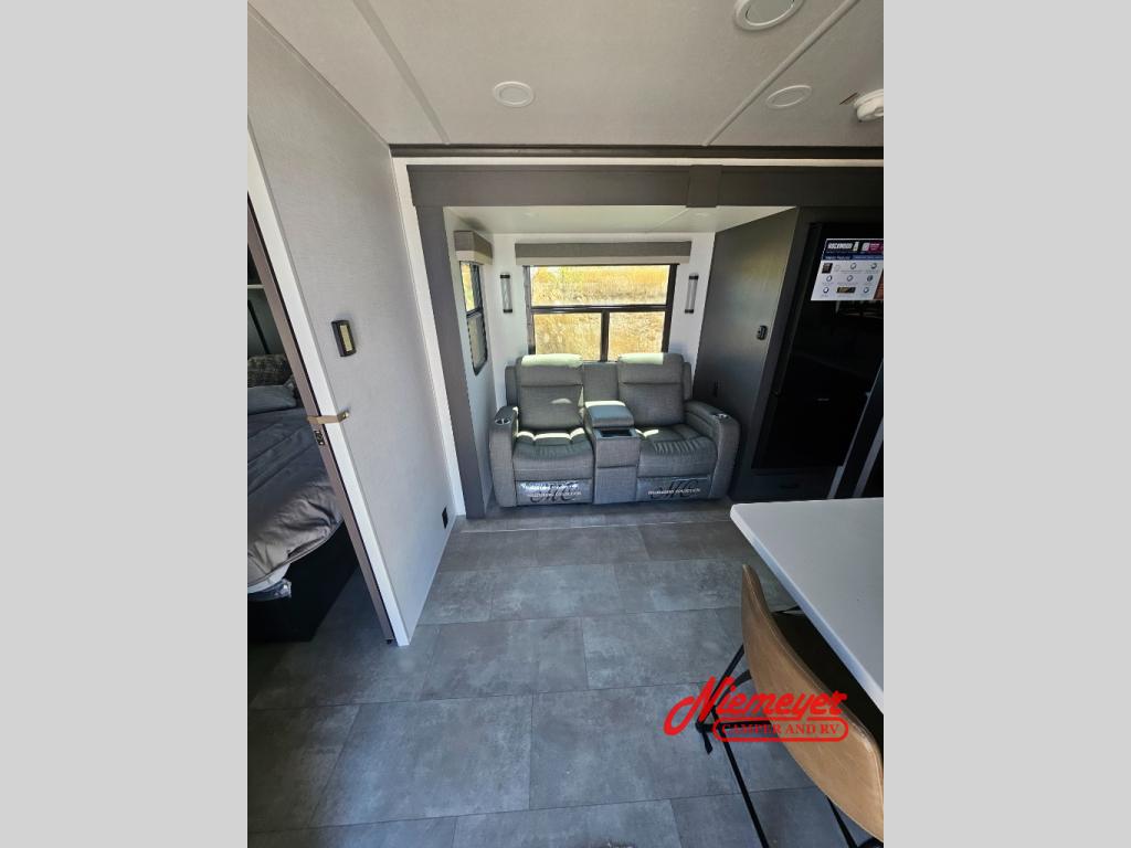 This front kitchen, couple's trailer is ready for adventure when you are! Once you arrive at your destination, prepare a quick lunch on the outside griddle, and enjoy the shade provided by the 19' power awning. You can eat outside, or inside at the counter with stools. The theatre seat will make this travel trailer feel more like home, and the double slides provide more space to stretch out. Within the master bedroom you'll find a king bed, a large wardrobe and a dresser, plus an optional TV. And check out the full rear bath with dual bath sinks and a shower with a seat! Now, that's what I call comfort!