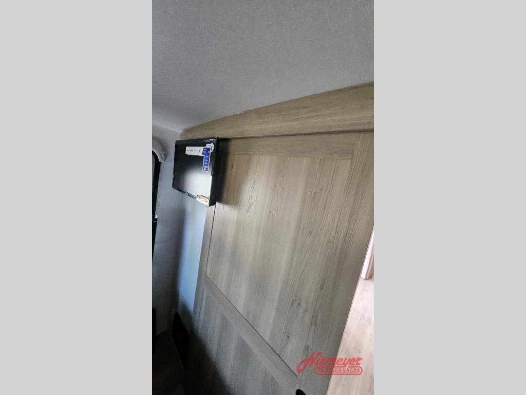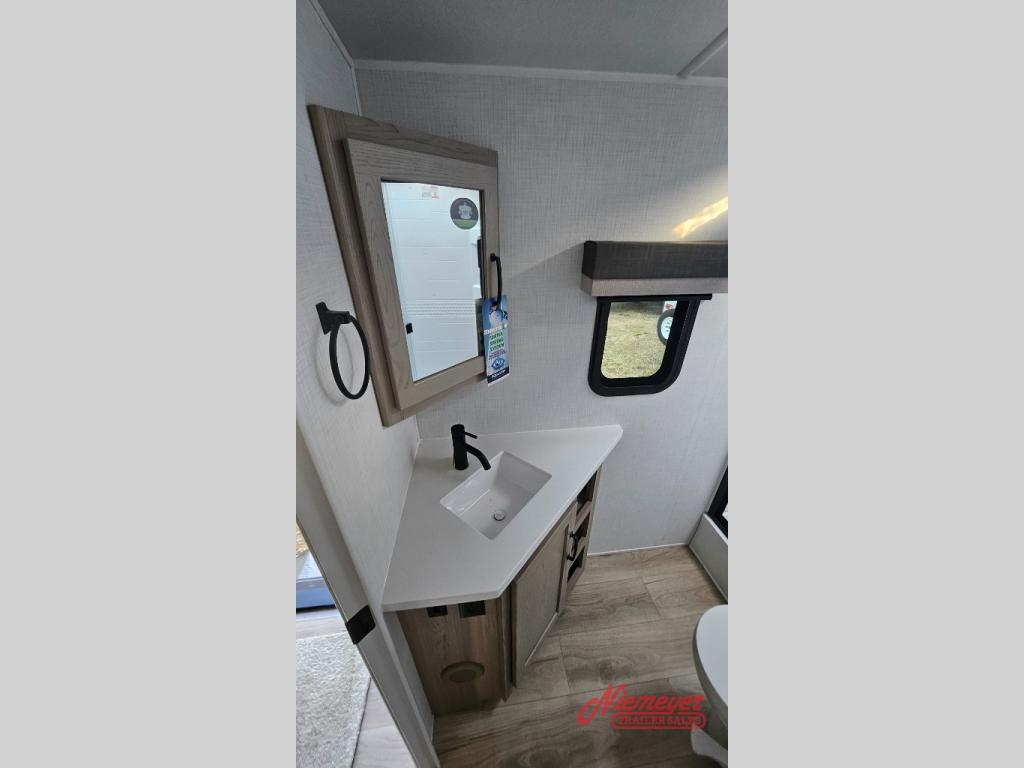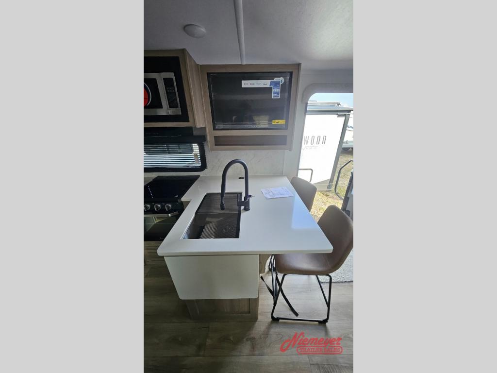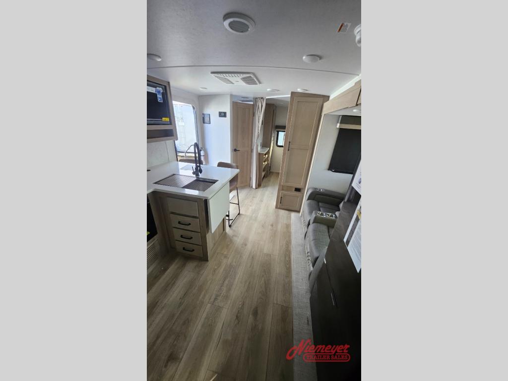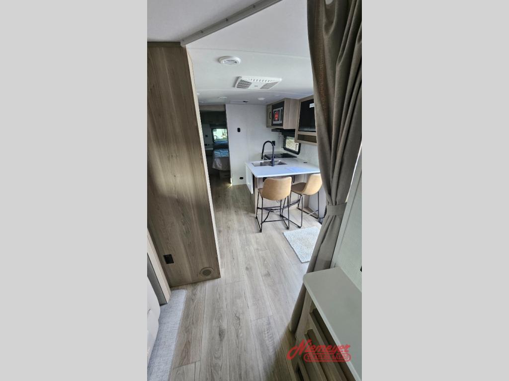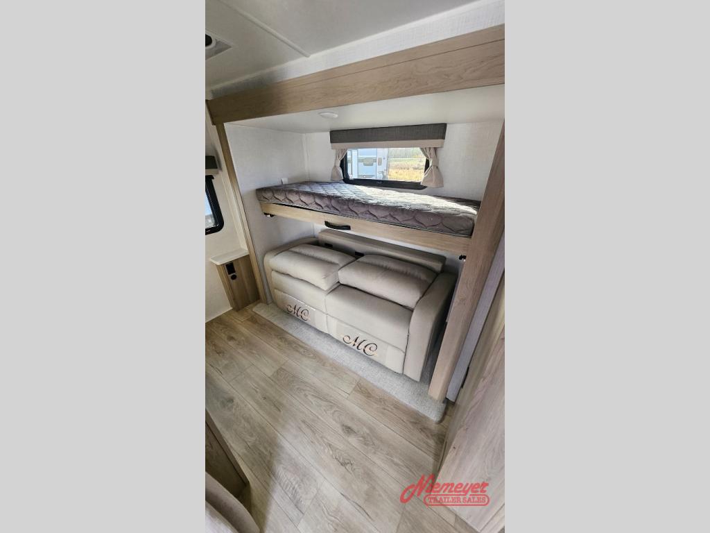 This is the perfect travel trailer to camp with friends and family since it has a private bunkhouse in the back with a flip-up bunk and a 68" sofa. The full bath is close by, as well as the main entry door for convenience. You'll find the second entry door leading into the front private bedroom that includes a queen-size bed, a wardrobe slide out, and an optional TV if you enjoy movies in bed. The U-shaped kitchen includes everything you need to prepare meals each day, and there is even an exterior griddle if you like to cook outside. In the evening, your crew can get comfortable on the theater seat or choose the optional hide-a-bed sofa if you're needing more sleeping space!