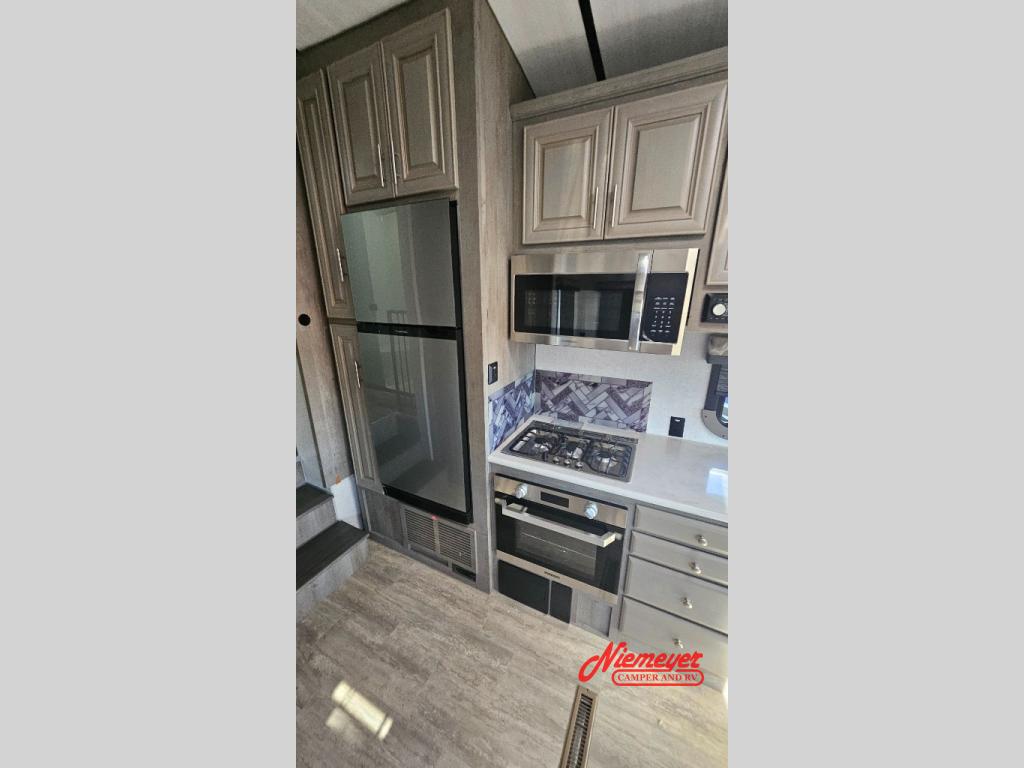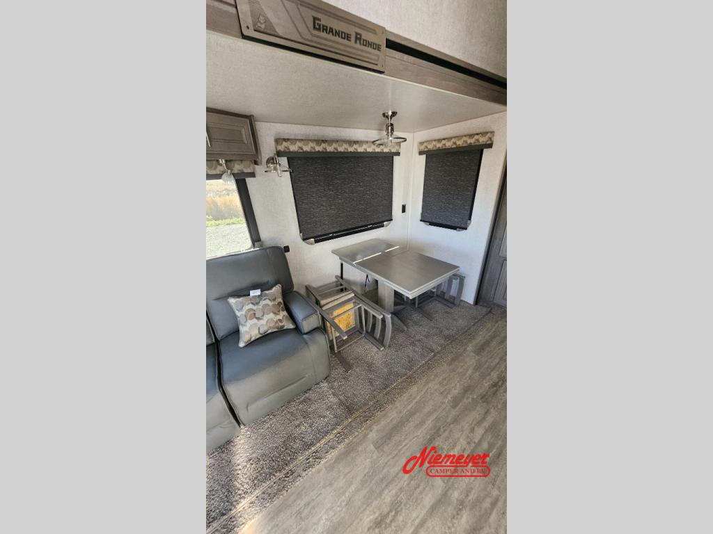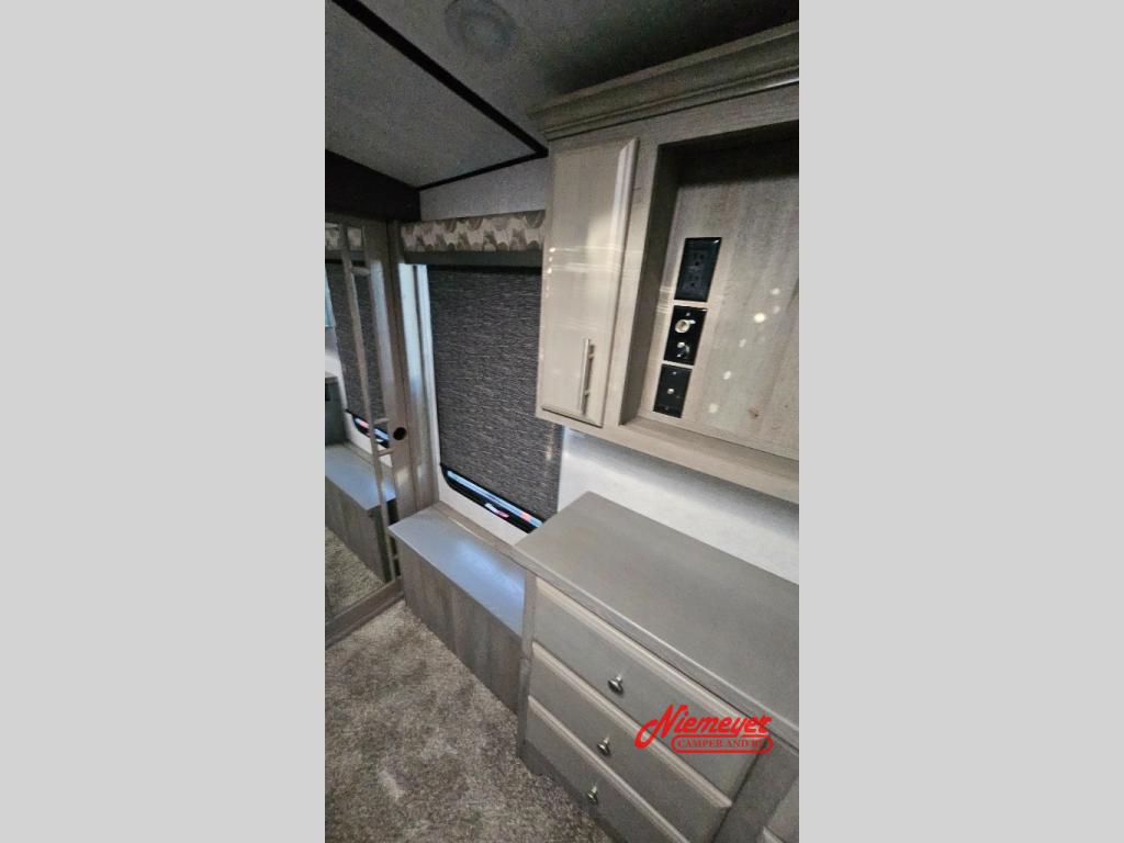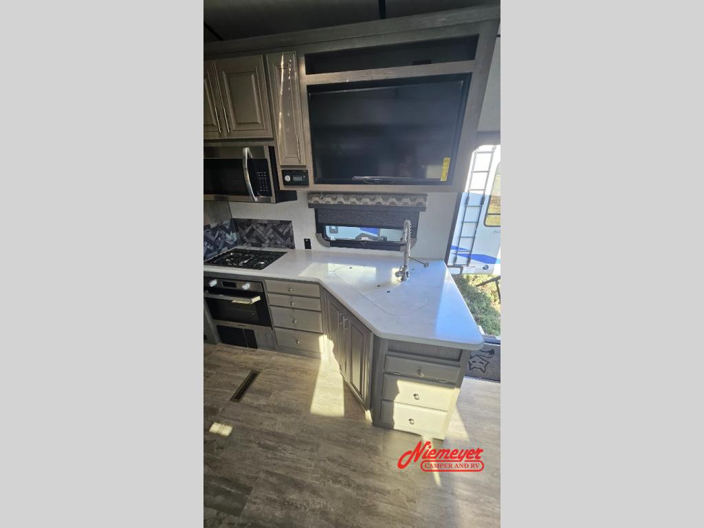 If you enjoy living in your RV or staying for long periods of time at your favorite destination, this fifth wheel offers a couple or even a small family comfort and convenience throughout. There is a spacious bathroom with a fiberglass shower including a seat and a private toilet and sink, a tri-fold sofa providing extra sleeping space for family or friends along with your own king bed in the front bedroom. The cook will love the kitchen which includes a convection microwave, and a free-standing dinette with four chairs that offers a nice place to eat. The two swivel rocker-recliners also provide a cozy space to visit as well as watch the 40" LED Smart TV.
