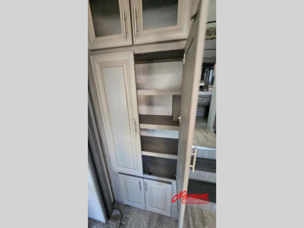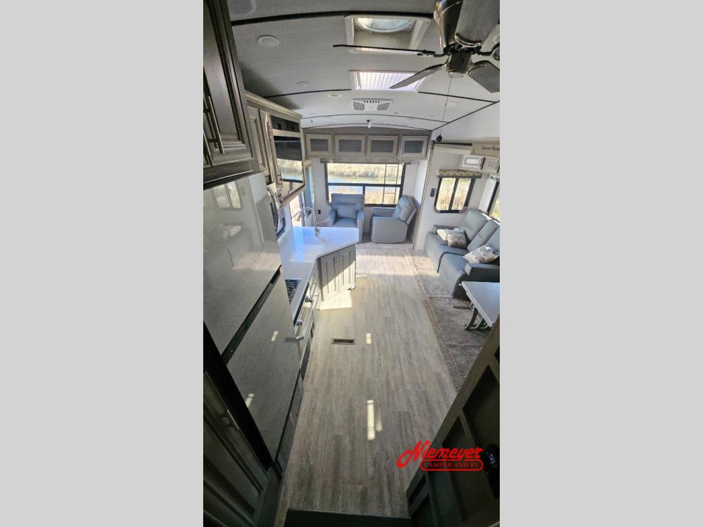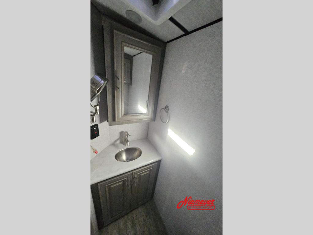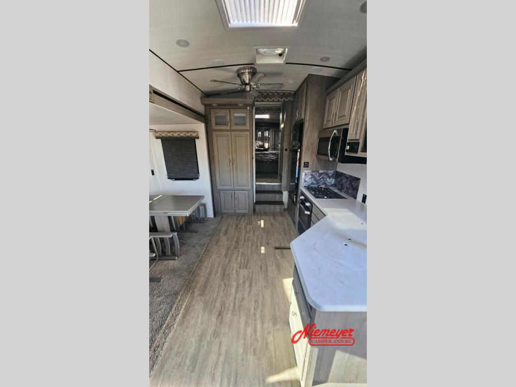 If you enjoy living in your RV or staying for long periods of time at your favorite destination, this fifth wheel offers a couple or even a small family comfort and convenience throughout. There is a spacious bathroom with a fiberglass shower including a seat and a private toilet and sink, a tri-fold sofa providing extra sleeping space for family or friends along with your own king bed in the front bedroom. The cook will love the kitchen which includes a convection microwave, and a free-standing dinette with four chairs that offers a nice place to eat. The two swivel rocker-recliners also provide a cozy space to visit as well as watch the 40" LED Smart TV.