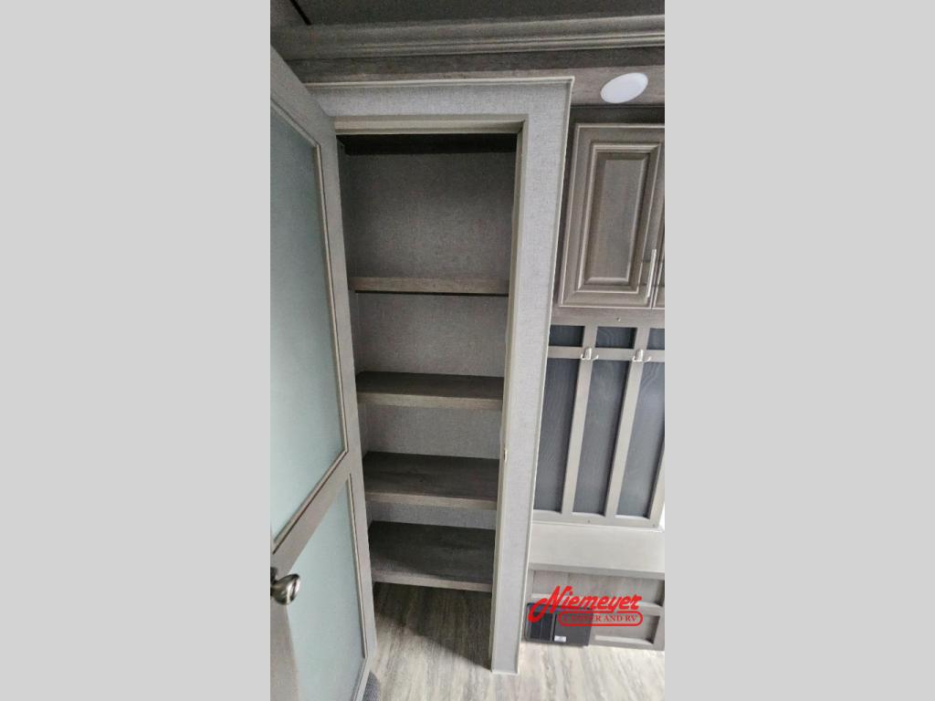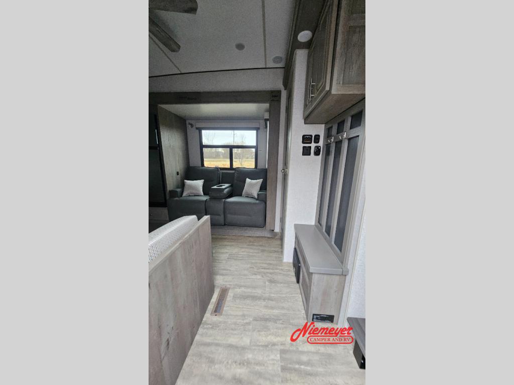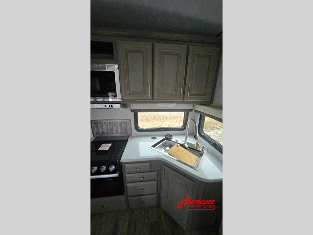 Pack your bags and head to your local state park for fun trips in this rear kitchen travel trailer. There is a three burner range and residential style microwave with an air fryer to whip up your best meals, and you're sure to appreciate the generous counter space. The mudroom bench provides a place to pull your hiking boots off, and the pantry lets you keep snacks stocked. This space also includes a booth dinette that converts to a 40" x 76" sleeping area for guests plus theater seating within a slide for more comfort and space. A spacious full bath will let you freshen up after a day outdoors, and a front private bedroom will make you feel right at home. There is a queen bed here, along with dual bedside wardrobes and a wardrobe slide for more space when getting dressed in the morning!