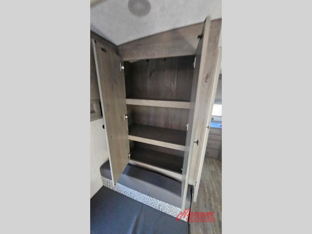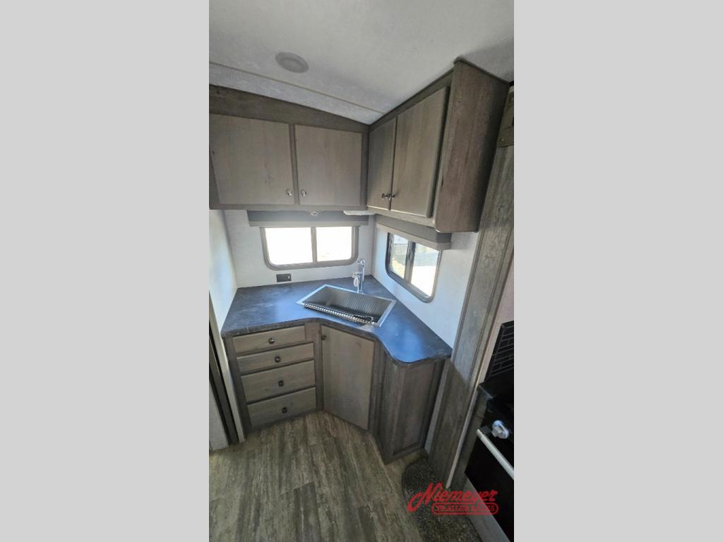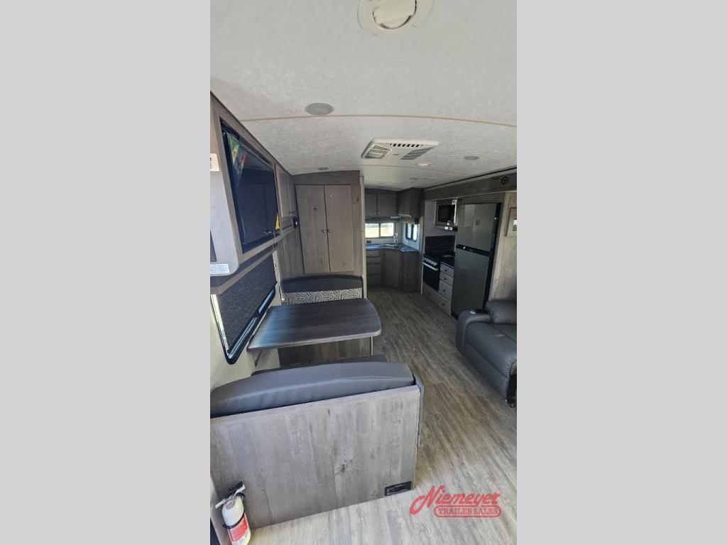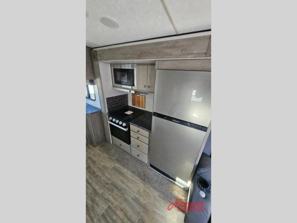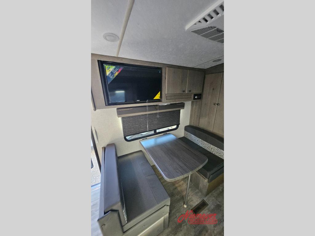 Escape to the campground in this travel trailer for three to four. The front queen bed includes dual wardrobes to keep your clothes tidy and overhead cabinets for your belongings. You can relax on the theater seating within the large slide out, and the booth dinette can convert to a 40" x 75" sleeping area for guests. The rear of this unit is shared with the full bath and the kitchen counter with a stainless steel sink. You can prepare meals on the three burner range and keep food fresh in the 10 cu. ft. 12V refrigerator.