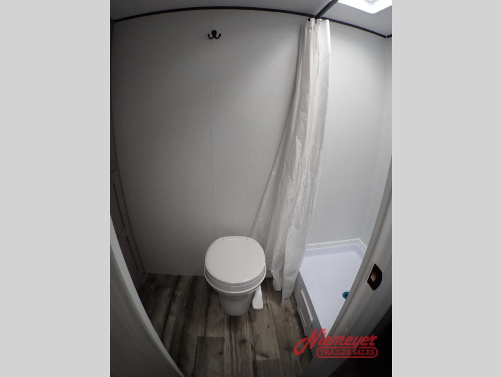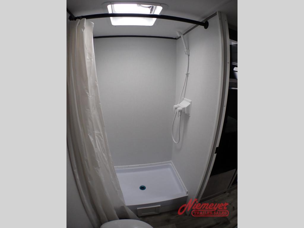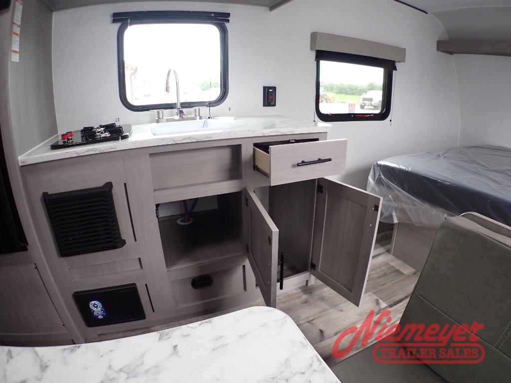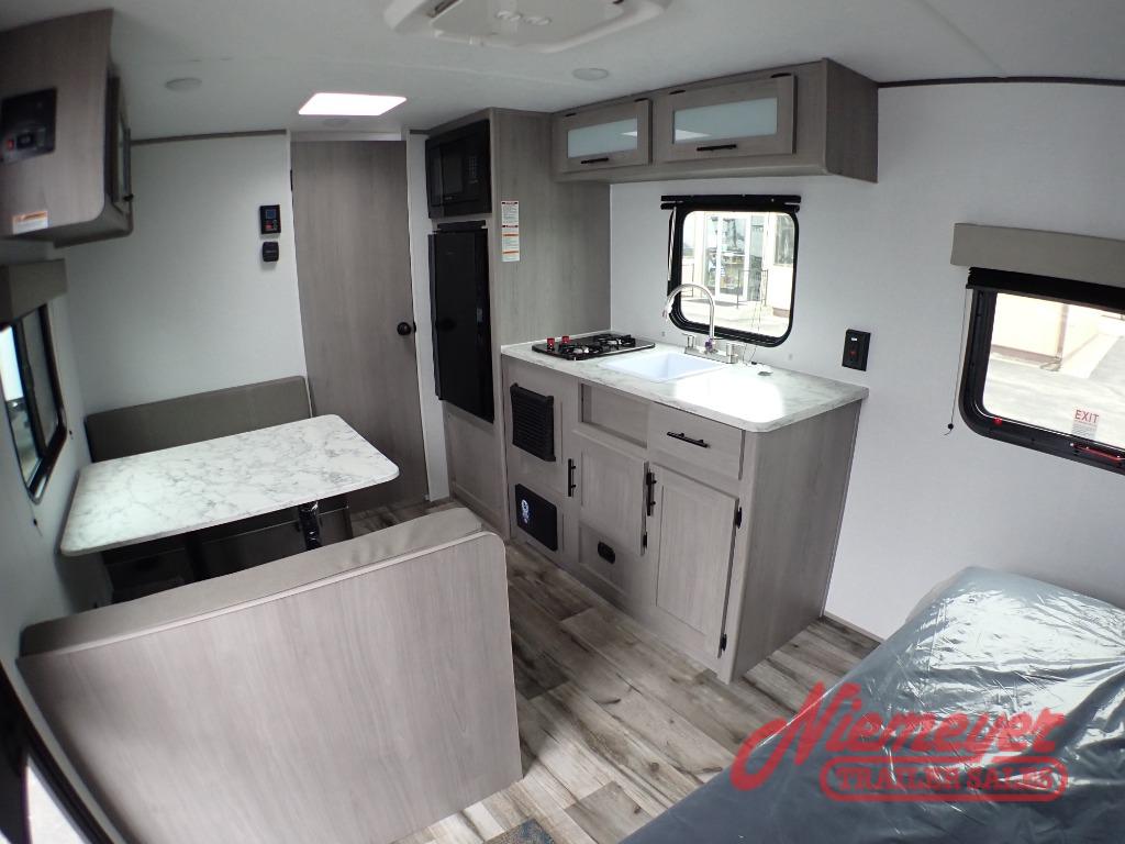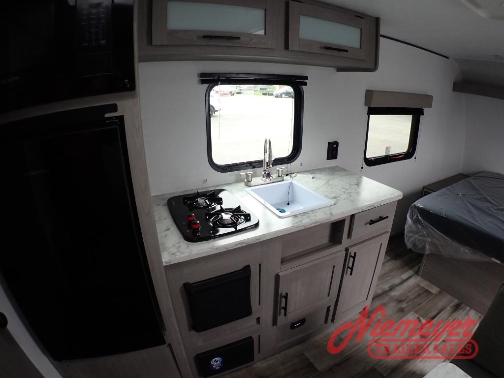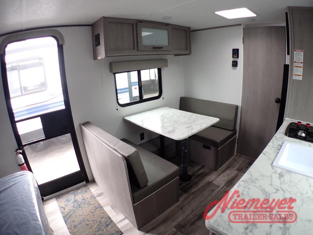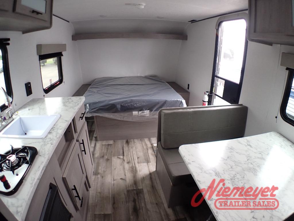 A perfect couples coach that could sleep one or two more, depending on size, using the booth dinette which can be converted at night This unit is cozy and convenient providing you just what you need to enjoy a little adventure away from home. For meals, there is a two burner cooktop and sink, plus a 3.3 cu. ft. refrigerator for your perishables. Overhead cabinetry can be found along both sides for your dishes and things. You will all appreciate the convenience of having your own private shower and toilet so that you don't need to use the campground facilities at night. You will also enjoy spending time outside with an 8' awning to provide even more living space outdoors!