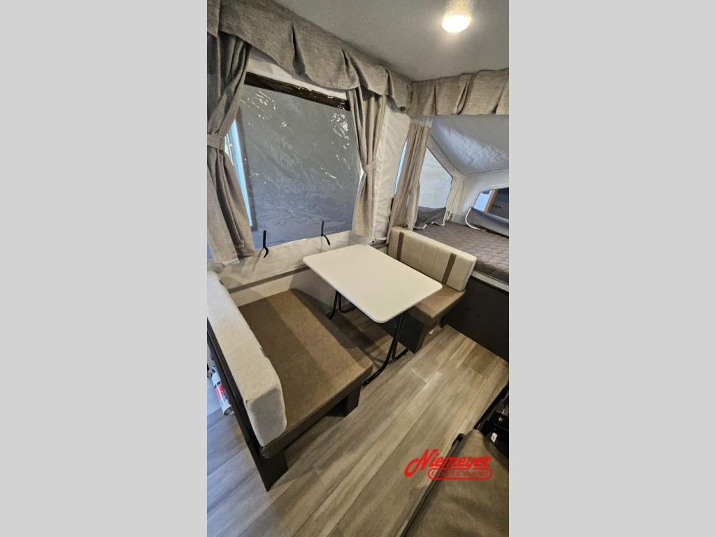 This Rockwood Freedom Series folding pop-up camper is going to let you camp in freedom! You will be able to use the outdoor griddle to cook up some delicious food, and the 9' awning with an LED light will keep you protected while you work. You will also find that the booth dinette will be useful for both meal time and bed time when the two tent end beds aren't enough space, and the storage lid under the front bed provides storage for luggage, blankets, and more!