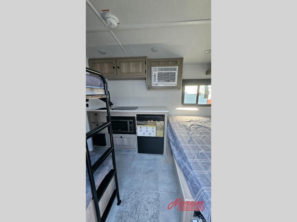 Perfect for couples, families, or friends, this trailer offers a comfortable and functional space to relax, recharge, and explore. The full bathroom is a serene retreat, equipped with everything you need to refresh and rejuvenate after a day of adventure. The two bunk beds give a snug and inviting sleeping spot, perfect for kids or adults looking for a cozy spot to rest. The kitchen is equipped with a microwave for quick and easy meal prep, and a refrigerator to keep your favorite snacks and drinks fresh. Overhead cabinets provide plenty of storage for your gear, cookware, and essentials, keeping your trailer tidy and organized. The bed offers a restful sleeping space, perfect for unwinding after a long day of exploring.