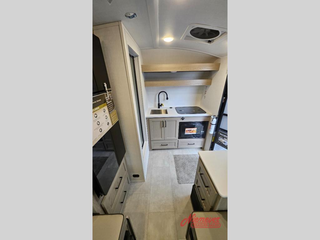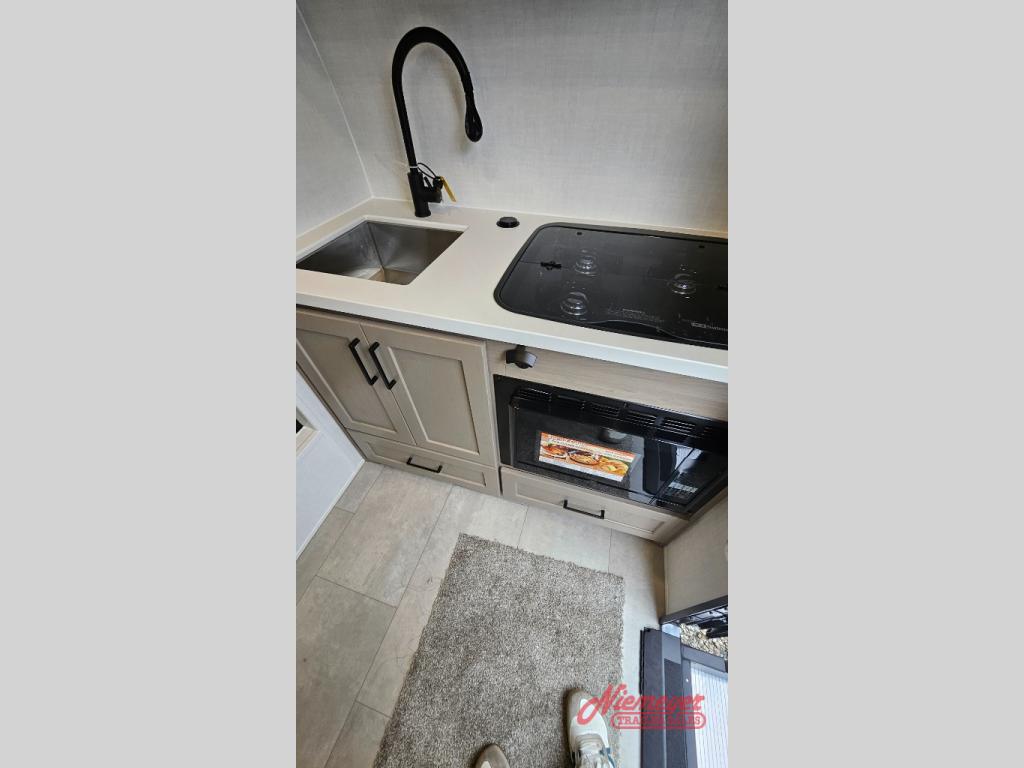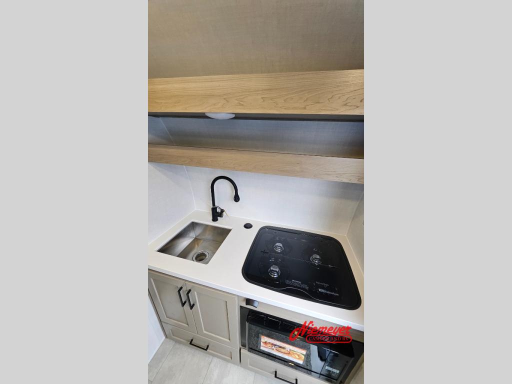 It won't be hard to find comfort in this travel trailer. It may be smaller on size, but it doesn't skim on features. The twin beds convert to a king-size bed for your comfort, and there is even a 12V TV to enjoy in the evenings. The kitchen includes a three burner cooktop, a convection microwave, plus a 12V refrigerator for perishables. You'll find overhead compartments for your valuables and exterior storage for your hiking gear!