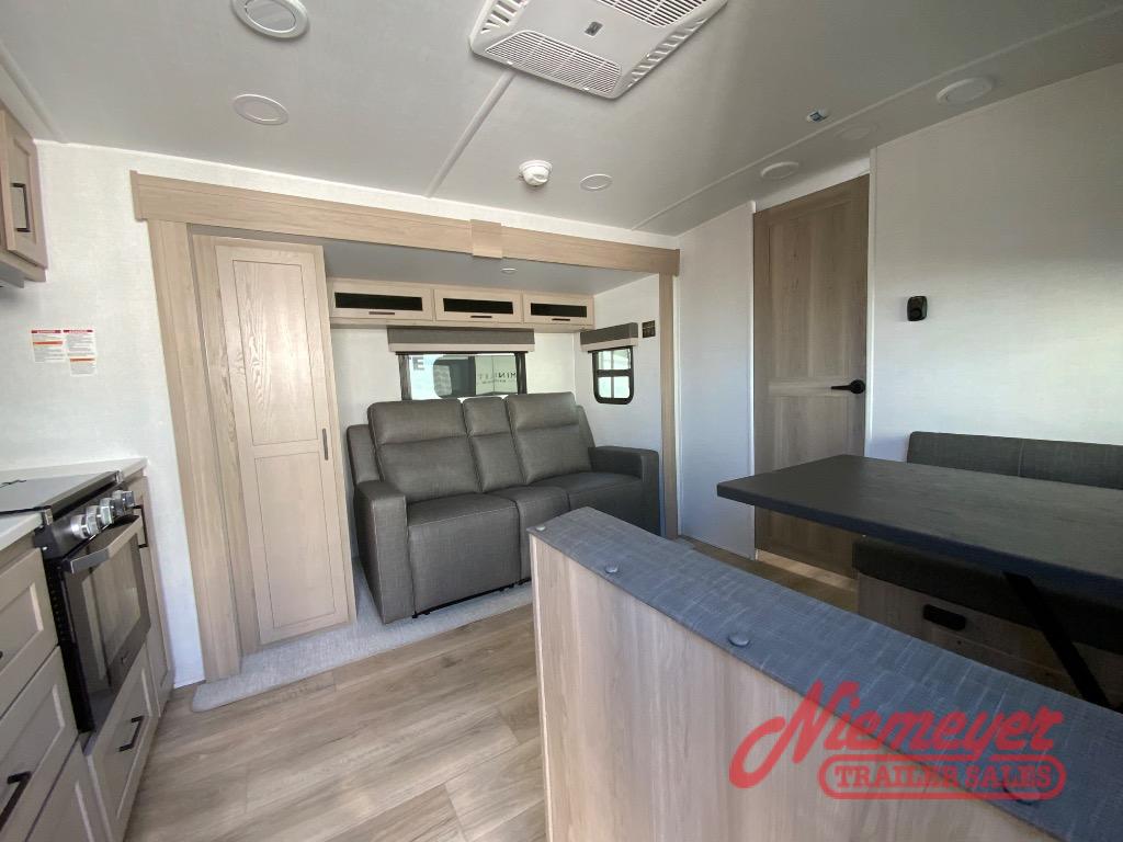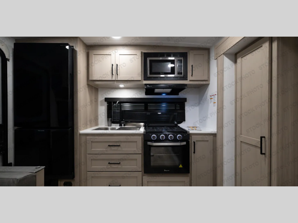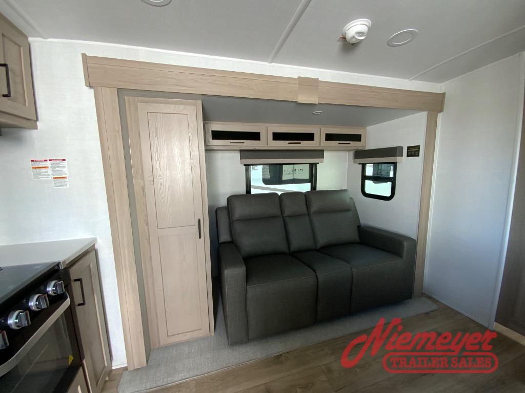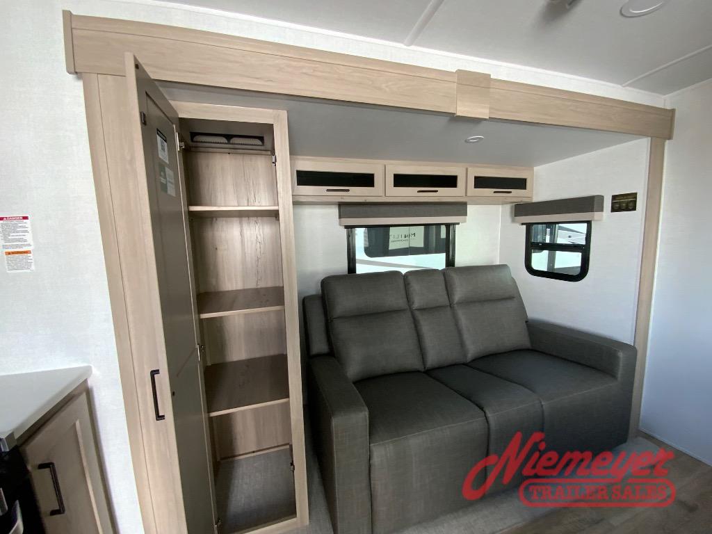 You and your spouse will have a great time camping in this travel trailer! You will have your own RV queen bed to sleep on in the front private bedroom, and an optional TV can be added if you enjoy the morning news in bed. Breakfast can be made on the three burner cooktop in the rear kitchen. The 67" theater seating with cupholders will provide a place to relax and dine together, and the spacious walk-through bath will allow you to clean up before you head out for the day. This model includes plenty of storage space, including a pantry for your snacks, a wardrobe slide out in the bedroom, plus a drop-frame pass-through storage for larger camp gear!