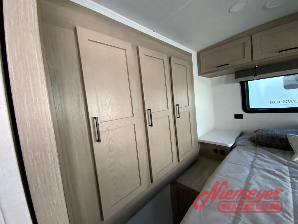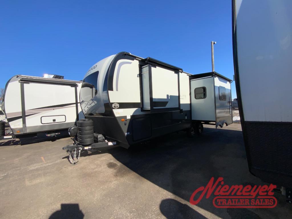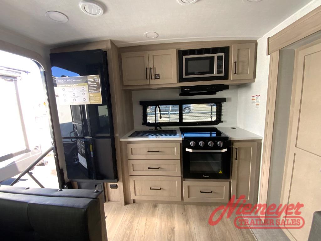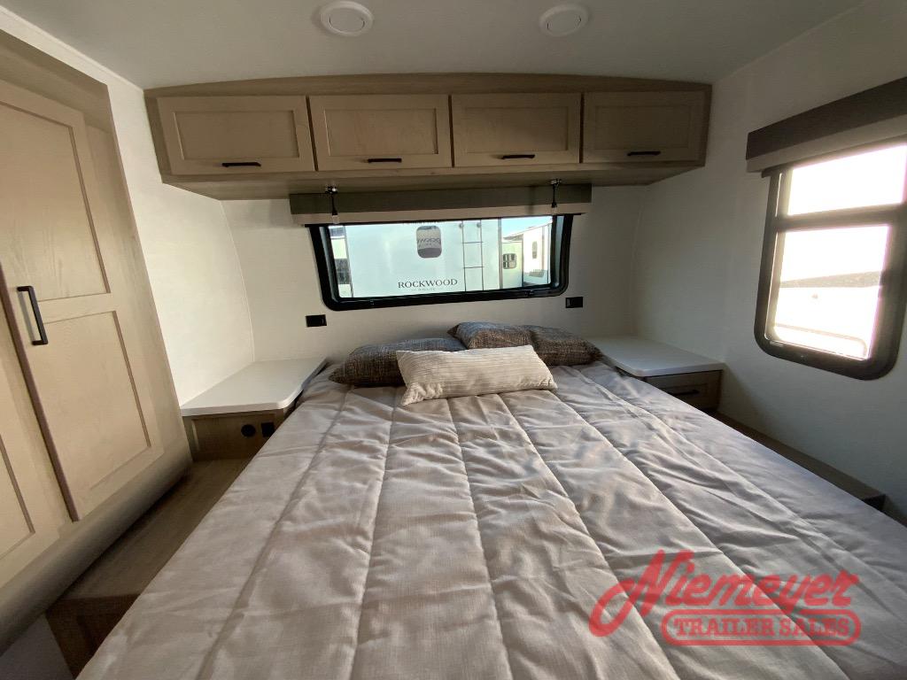 Each Rockwood Mini Lite travel trailer by Forest River is constructed with a fully laminated one-piece walkable roof, sleek frameless windows, and a six-sided full aluminum frame for strength and durability. The 12V thermostatically controlled heated tanks, plus radiant foil in the underbelly will allow you to camp well into the colder months, and the 200W roof solar panel will be perfect for a little off-gridding. Each model includes solid surface kitchen countertops, hidden hinge cabinet doors, roller shades, plus many more interior features. Having an AIR 360+ omnidirectional antenna with WiFi prep on board gives you the option to get some work done if it's needed, and the power tongue jack provides hassle-free set up, so you can enjoy more time relaxing!