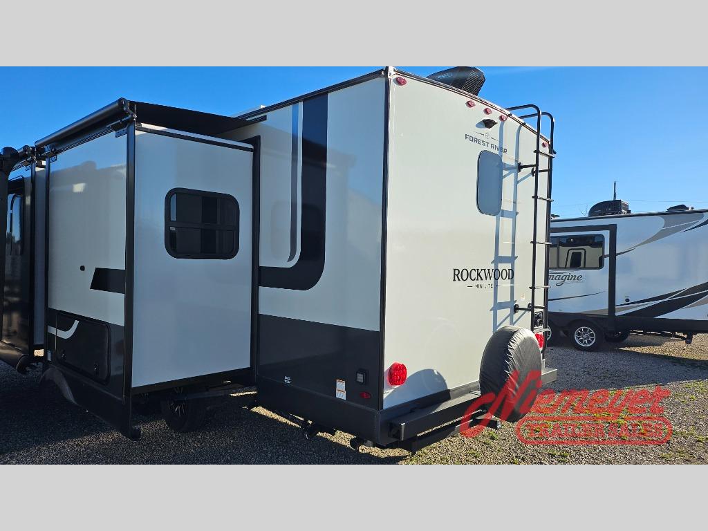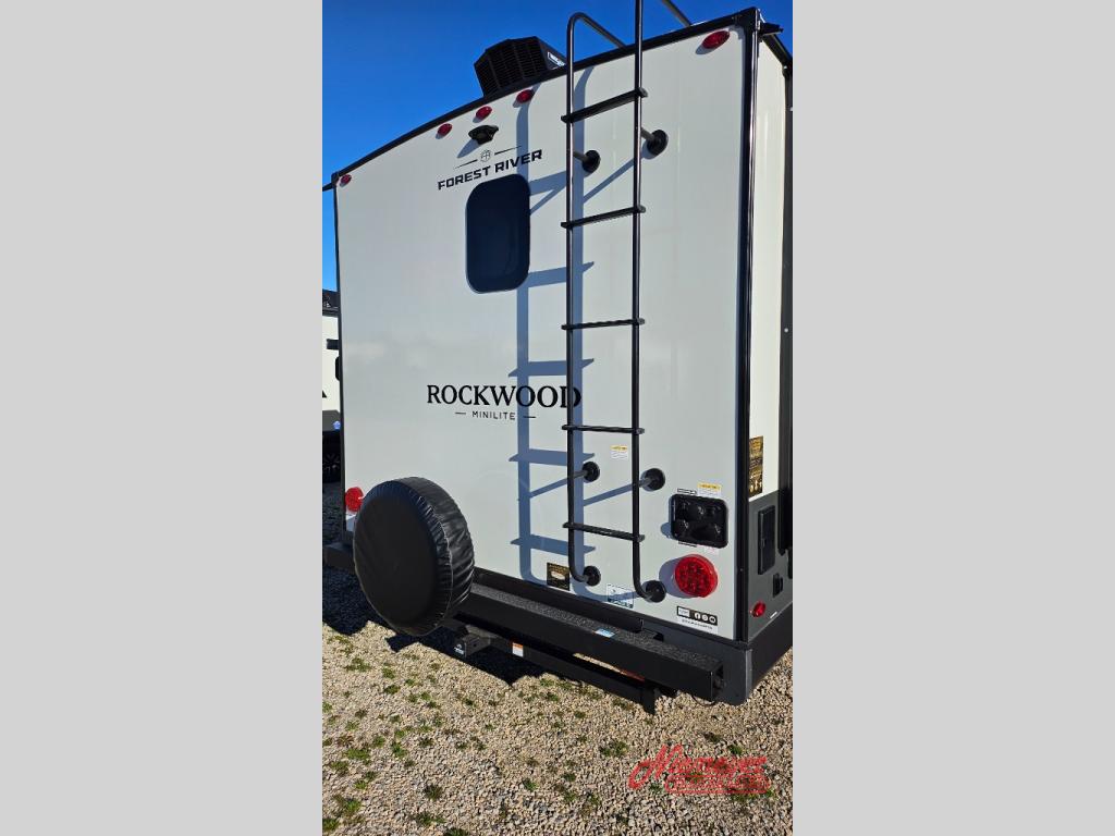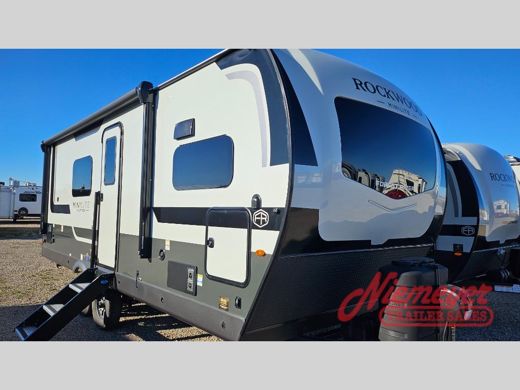 Each Rockwood Mini Lite travel trailer by Forest River is constructed with a fully laminated one-piece walkable roof, sleek frameless windows, and a six-sided full aluminum frame for strength and durability. The 12V thermostatically controlled heated tanks, plus radiant foil in the underbelly will allow you to camp well into the colder months, and the 200W roof solar panel will be perfect for a little off-gridding. Each model includes solid surface kitchen countertops, hidden hinge cabinet doors, roller shades, plus many more interior features. Having an AIR 360+ omnidirectional antenna with WiFi prep on board gives you the option to get some work done if it's needed, and the power tongue jack provides hassle-free set up, so you can enjoy more time relaxing!