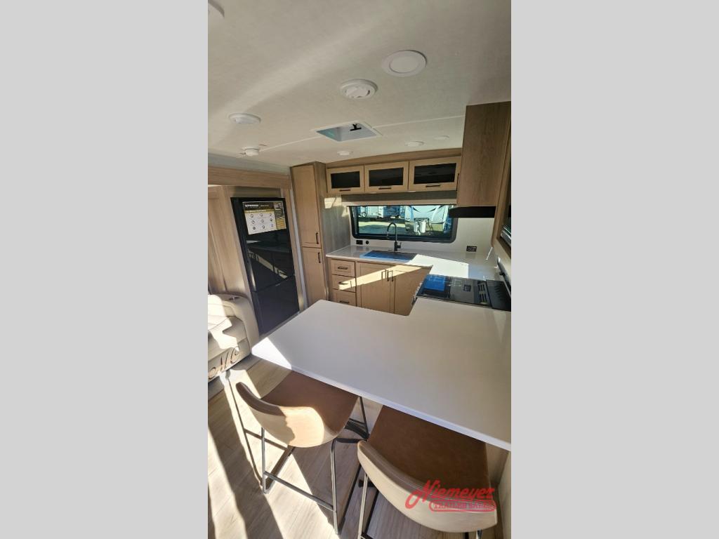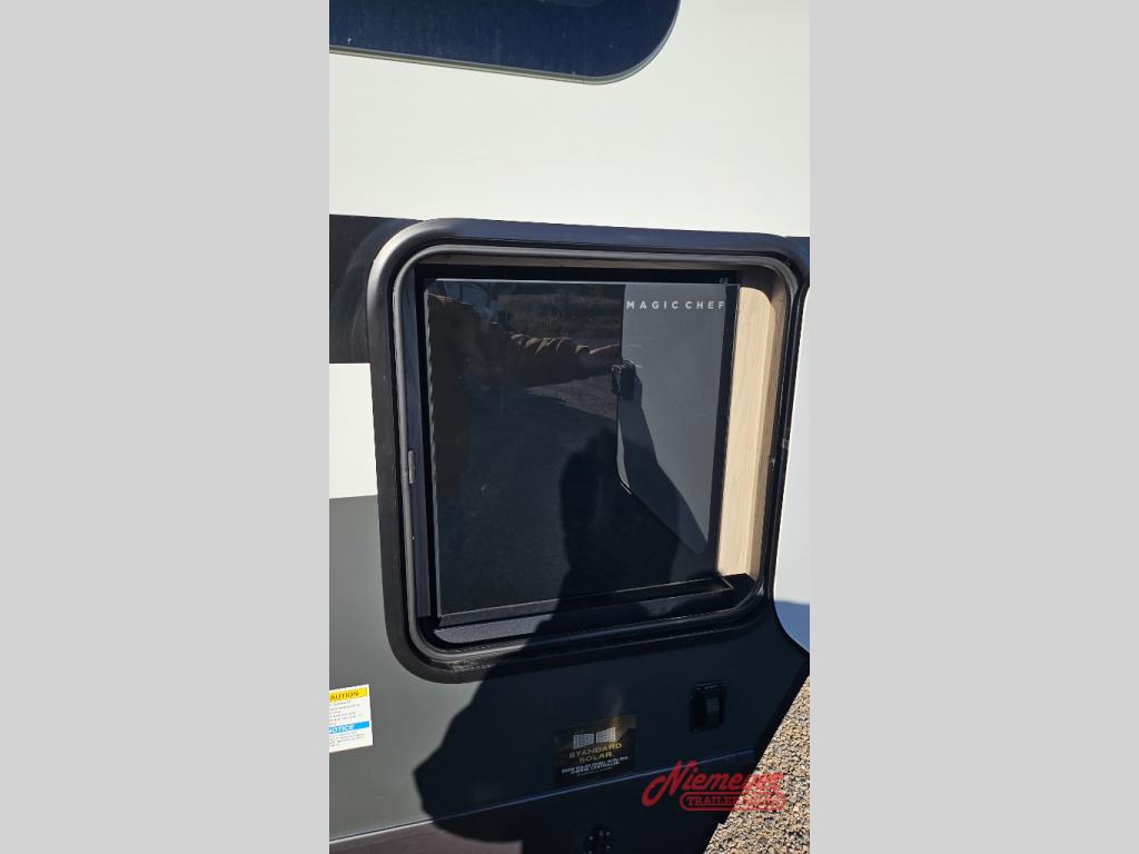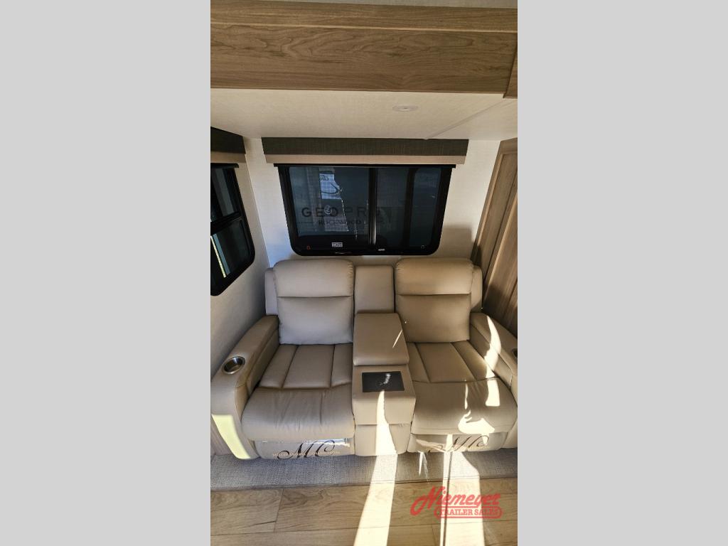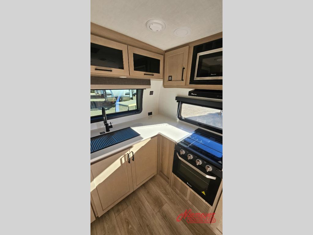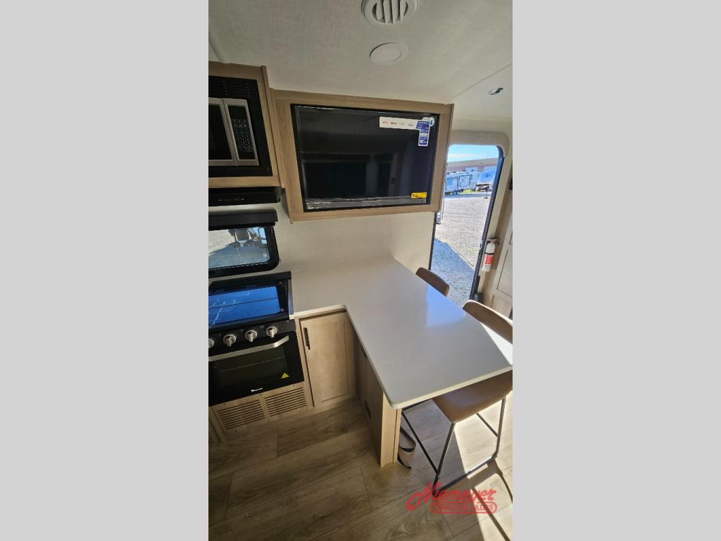 This travel trailer is the best option for you and your partner! The lavish full rear bathroom features a spacious layout and a convenient linen closet, perfect for relaxation and refreshment. The elegant bedroom boasts a plush queen bed, ample wardrobe space, and stylish dresser, creating a serene retreat. The spacious living room and kitchen combined area is the heart of the trailer, featuring plush theater seating for cozy movie nights, a generous closet for storing essentials, and a 12V Smart TV for entertainment on the go. Plus, the expansive countertop with chairs provides a perfect spot for gourmet meals or socializing, while the premium three-burner cooktop, well-stocked kitchen pantry, and high-performance microwave make meal prep and cooking a true delight.