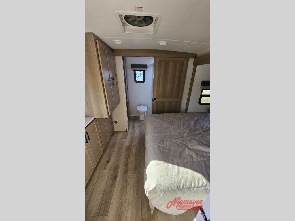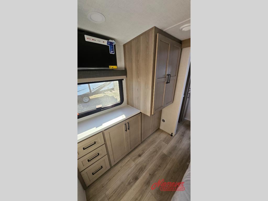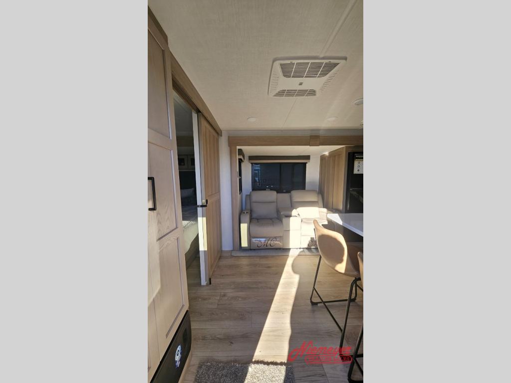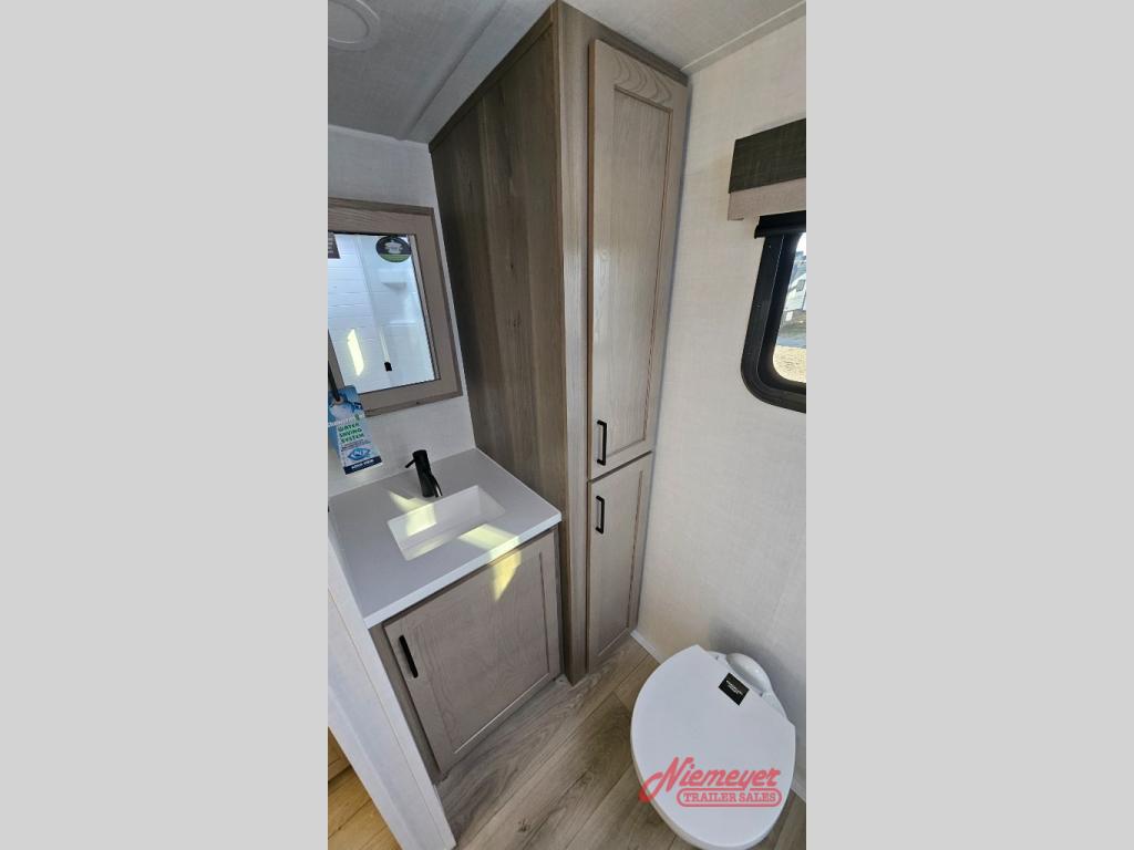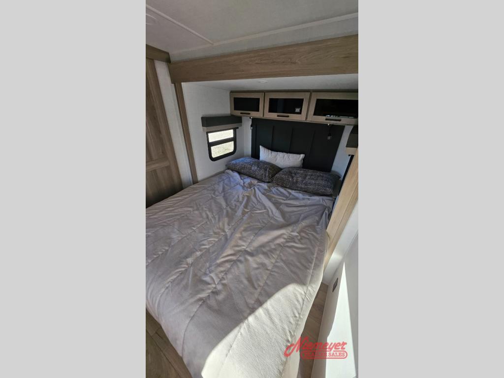 This travel trailer is the best option for you and your partner! The lavish full rear bathroom features a spacious layout and a convenient linen closet, perfect for relaxation and refreshment. The elegant bedroom boasts a plush queen bed, ample wardrobe space, and stylish dresser, creating a serene retreat. The spacious living room and kitchen combined area is the heart of the trailer, featuring plush theater seating for cozy movie nights, a generous closet for storing essentials, and a 12V Smart TV for entertainment on the go. Plus, the expansive countertop with chairs provides a perfect spot for gourmet meals or socializing, while the premium three-burner cooktop, well-stocked kitchen pantry, and high-performance microwave make meal prep and cooking a true delight.