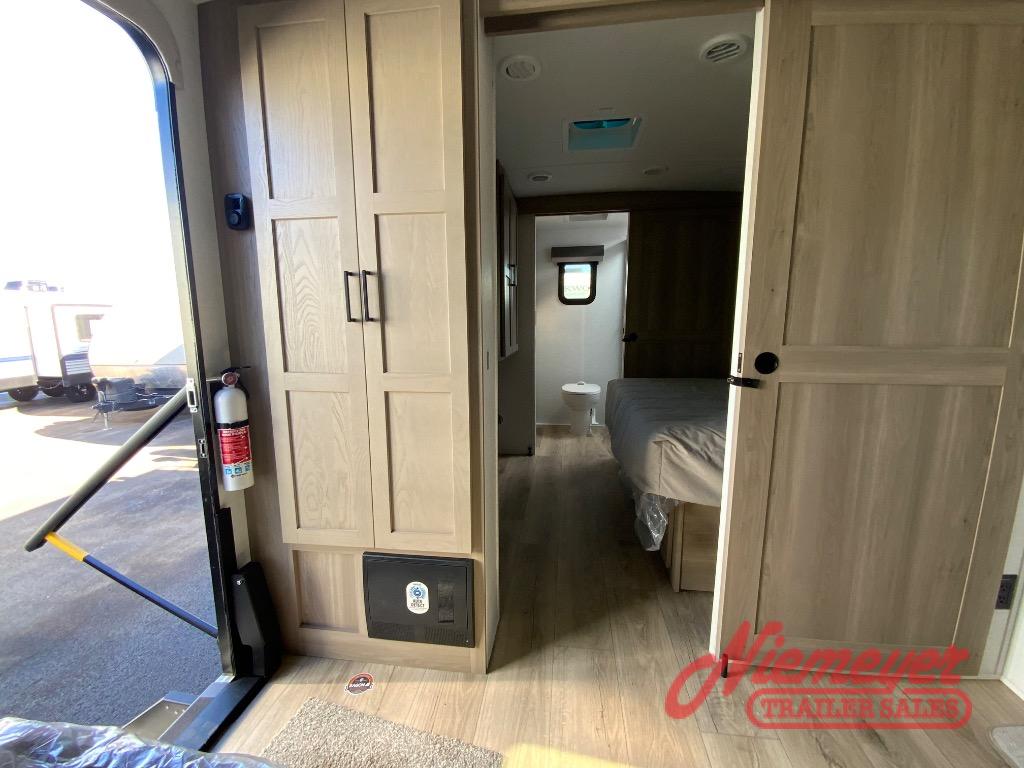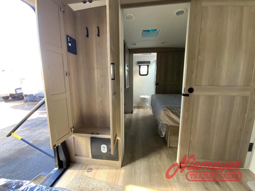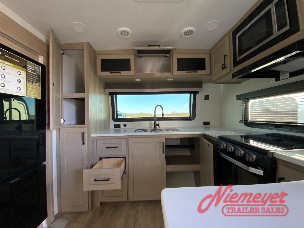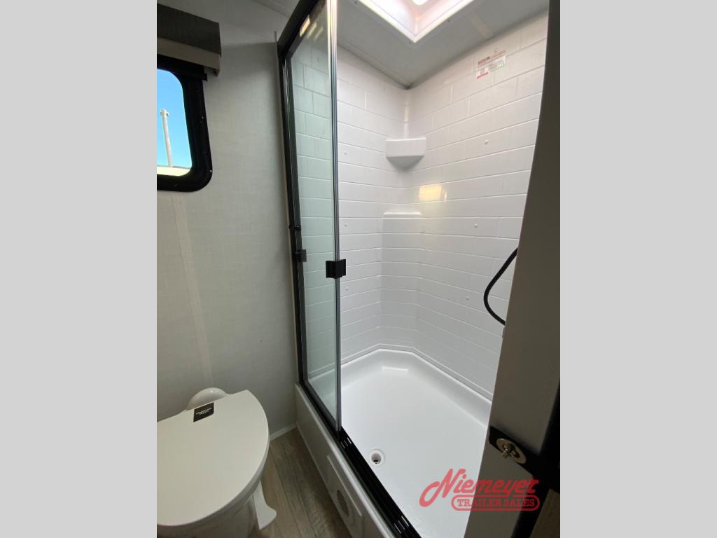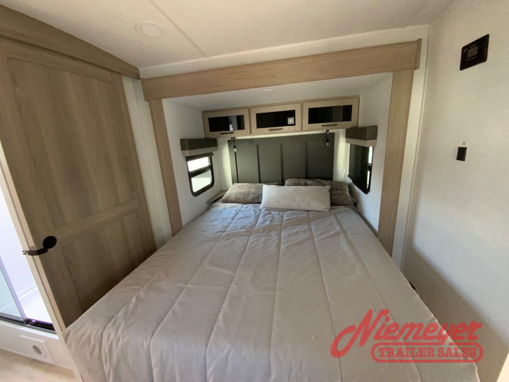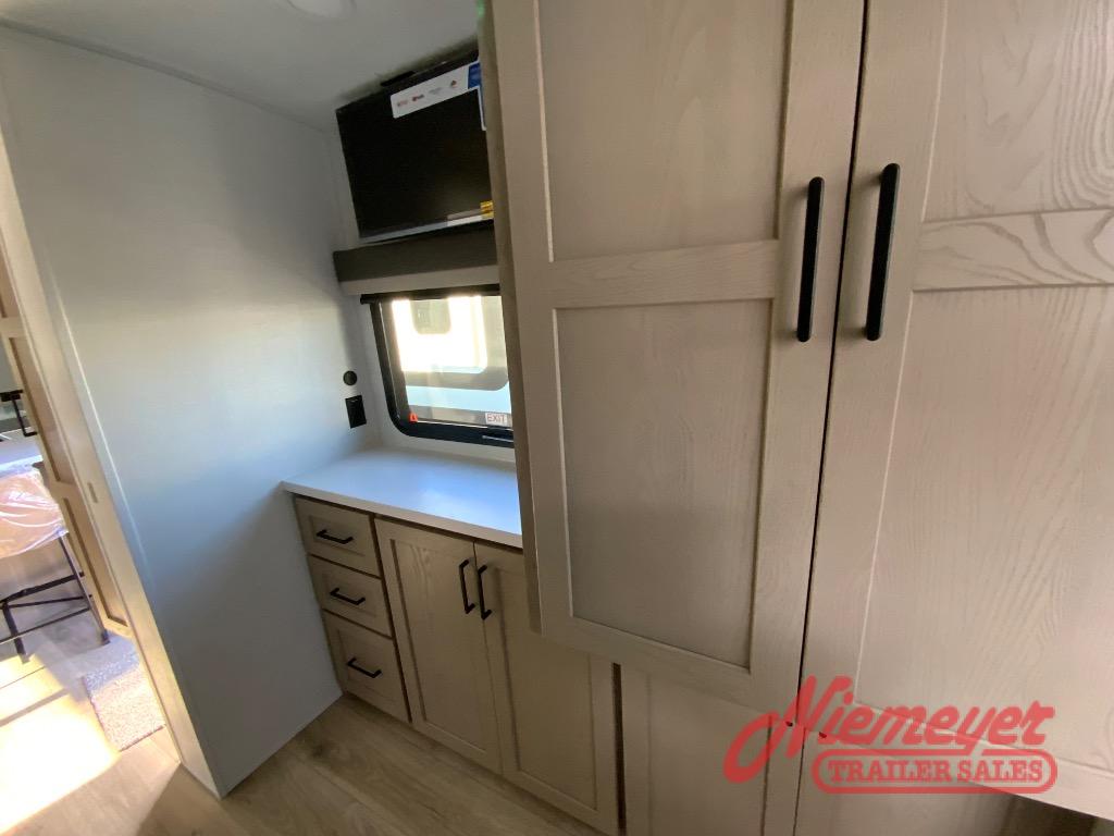This travel trailer is the best option for you and your partner! The lavish full rear bathroom features a spacious layout and a convenient linen closet, perfect for relaxation and refreshment. The elegant bedroom boasts a plush queen bed, ample wardrobe space, and stylish dresser, creating a serene retreat. The spacious living room and kitchen combined area is the heart of the trailer, featuring plush theater seating for cozy movie nights, a generous closet for storing essentials, and a 12V Smart TV for entertainment on the go. Plus, the expansive countertop with chairs provides a perfect spot for gourmet meals or socializing, while the premium three-burner cooktop, kitchen pantry, and microwave make meal prep and cooking a true delight.
