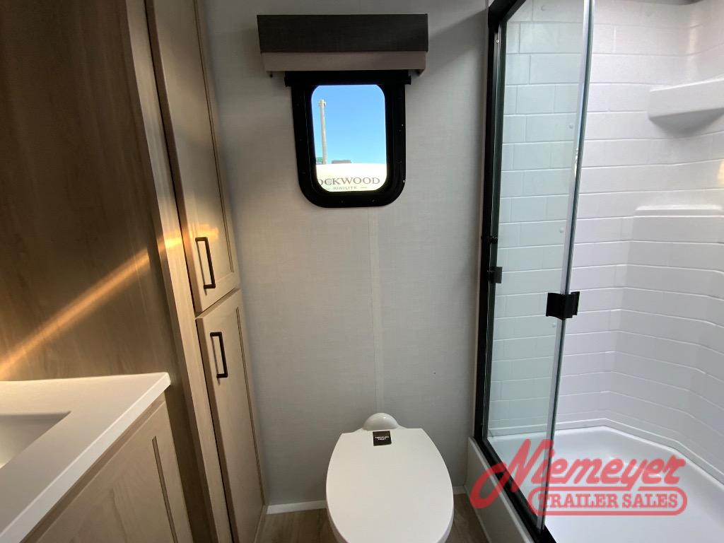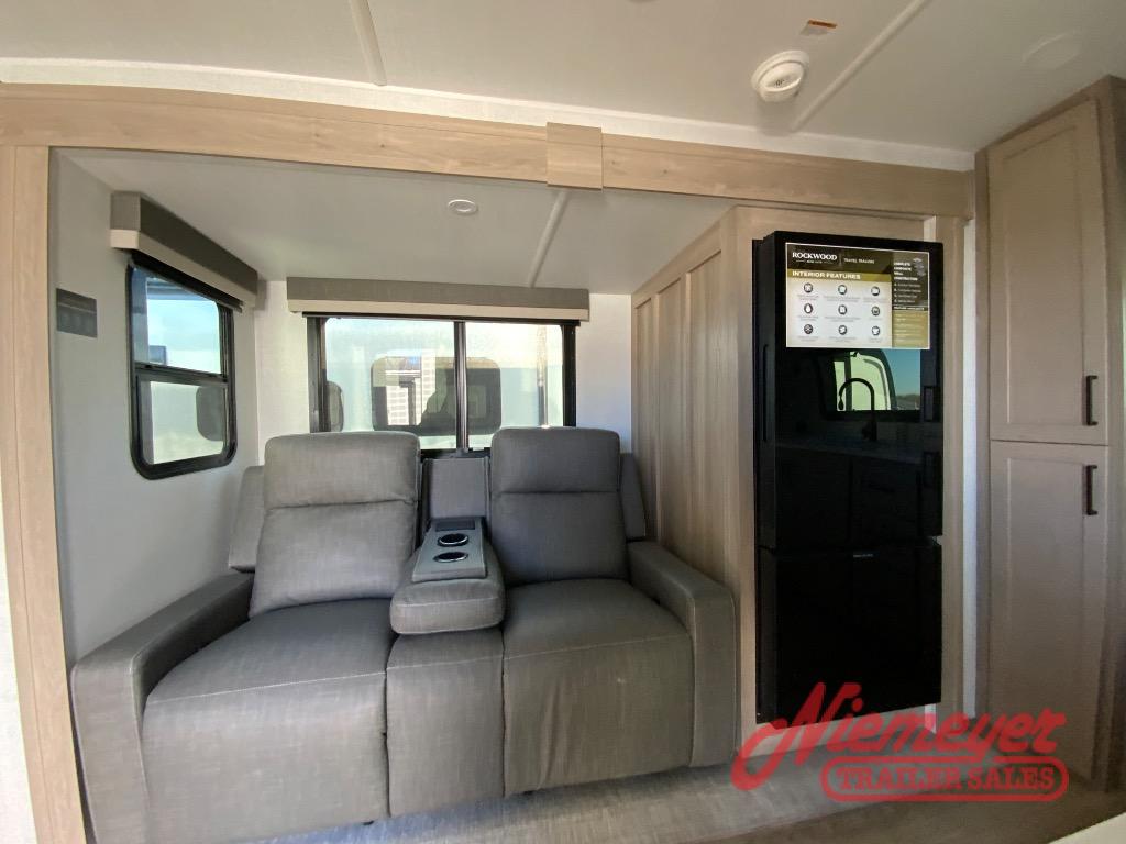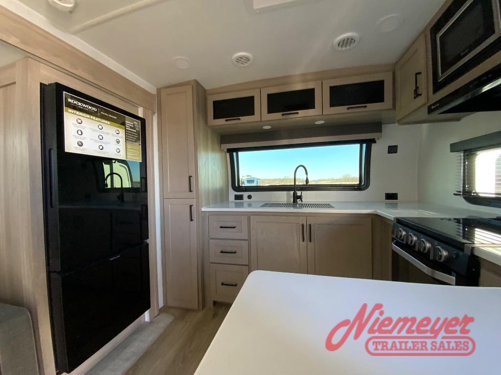 Each Rockwood Mini Lite travel trailer by Forest River is constructed with a fully laminated one-piece walkable roof, sleek frameless windows, and a six-sided full aluminum frame for strength and durability. The 12V thermostatically controlled heated tanks, plus radiant foil in the underbelly will allow you to camp well into the colder months, and the 200W roof solar panel will be perfect for a little off-gridding. Each model includes solid surface kitchen countertops, hidden hinge cabinet doors, roller shades, plus many more interior features. Having an AIR 360+ omnidirectional antenna with WiFi prep on board gives you the option to get some work done if it's needed, and the power tongue jack provides hassle-free set up, so you can enjoy more time relaxing!