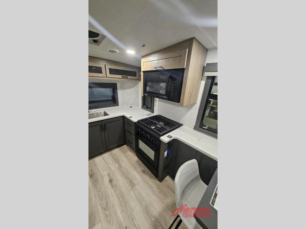 Premium amenities and a serene atmosphere make this fifth wheel your home away from home. The rear bedroom is a peaceful retreat, featuring a queen bed, spacious wardrobe, and a washer and dryer prep for added convenience. The full bathroom is a spa-like oasis, complete with a linen closet to keep your towels and toiletries organized. The theater seat is the perfect spot to relax and unwind, while the table & chairs with a leaf provide a comfortable space for meals and conversation. The televator TV is a sleek and modern touch, perfect for enjoying your favorite shows or movies. The pantry serves as a convenient storage space for your food and cooking essentials, while the fridge, microwave, and overhead cabinets provide ample space for meal preparation. The front countertop is the perfect spot to whip up a quick snack or breakfast.