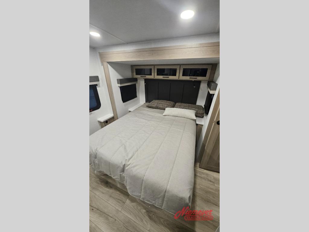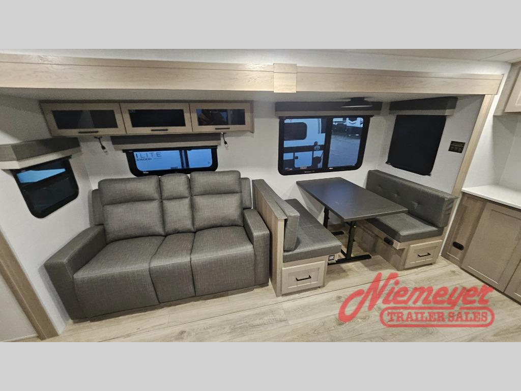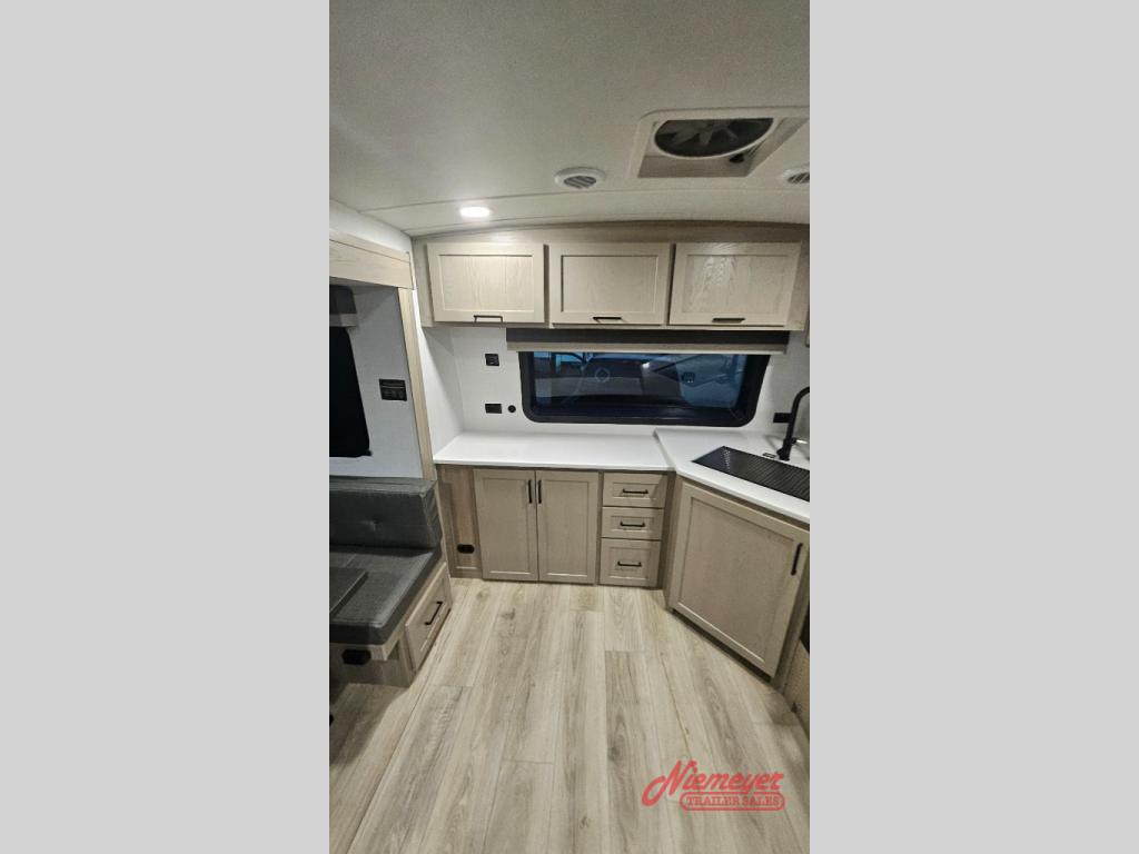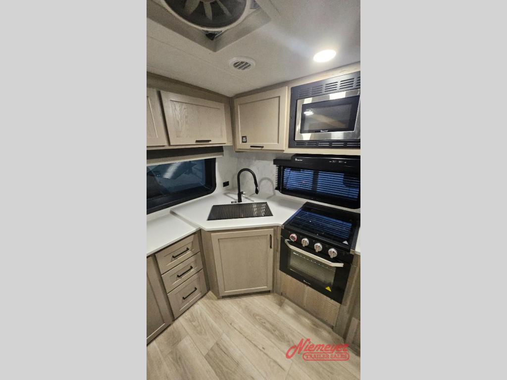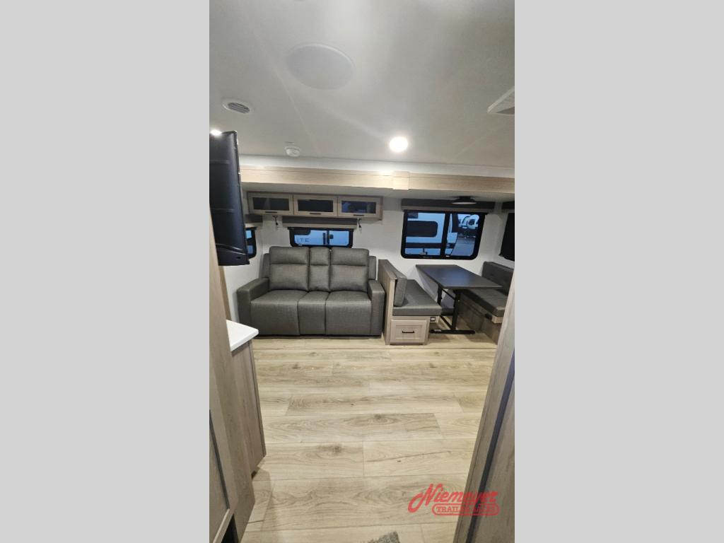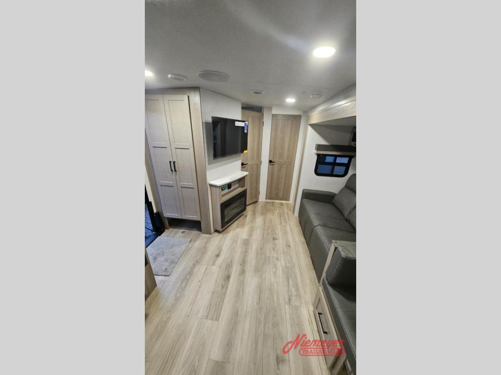 When you are outside this trailer you can enjoy the protection from the 21' power awning, you will also find exterior storage for your extra gear, and a ladder at the rear. You get to choose which entrance to step up into, be it the spacious rear bedroom with a queen bed slide and a wardrobe, or the main entry into the kitchen and living area. The furniture slide includes a booth dinette to eat your meals at, and theater seating to watch the Smart TV with a fireplace below. And the cook will love the front kitchen with extra counter space, a three-burner range, plus a 12V refrigerator and pantry for food storage!