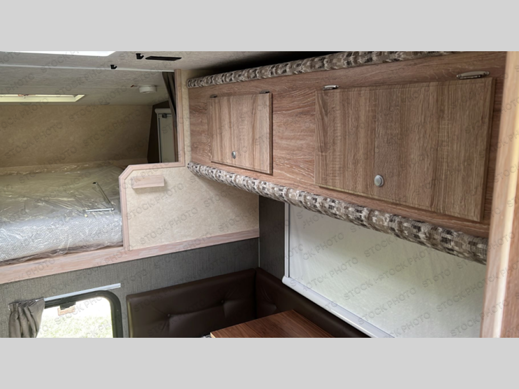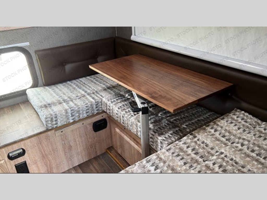 This truck camper is perfect for two people wanting to hit the open road with a home on the back of their 1/2 ton or larger full size short bed (6' 4" to 6' 10") or long bed truck (8')! Start each morning feeling clean and well rested after sleeping on the front cabover queen bed and showering in the wet bath. There is storage on either side of the bed, a TV stand at the foot of the bed on one side, and a wardrobe on the other side, plus a second wardrobe next to the two-burner stove and sink. Once you have prepared a delicious home cooked meal, you can enjoy it at the U-shaped dinette and even transform it into an extra sleeping space!
