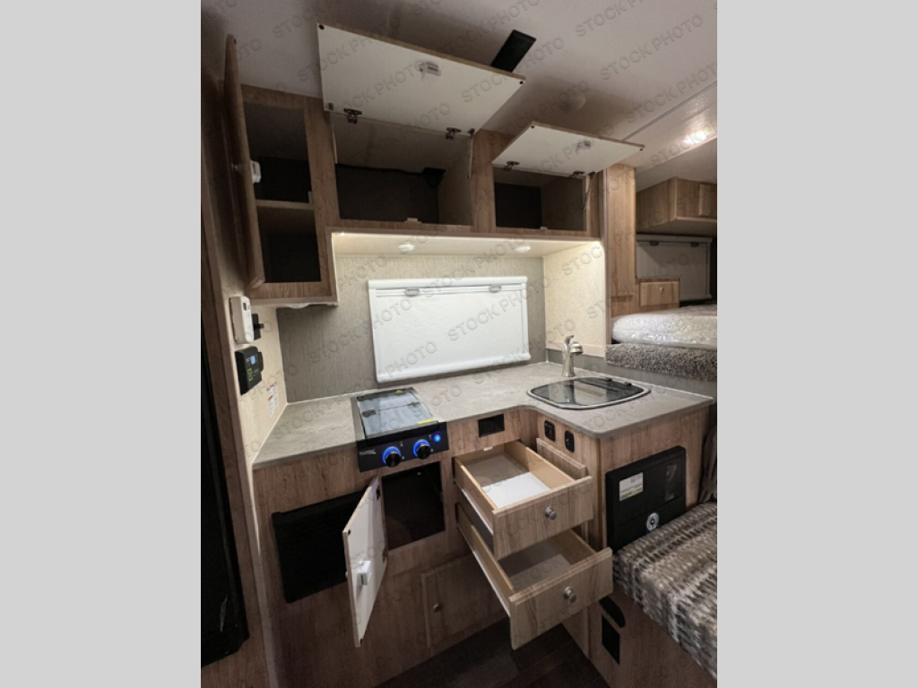 Enjoy camping trips in this truck camper that fits short of long beds. There is a two burner stove with a folding glass top to cook and a glass top sink to clean dishes each day, plus a 10 cu. ft. compressor double door refrigerator to keep food fresh. A wet bath includes a shower, cassette toilet, overhead cabinet, 12V push out fan, and even a bath skylight! The 6" "Sure Sleep" gel foam mattress will provide a great night's rest, and you'll find a CPAP area with 110V/12V USB ports to keep electronics charged.