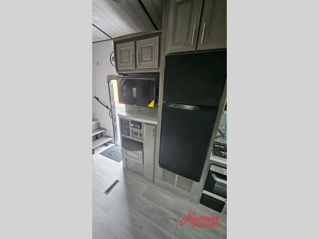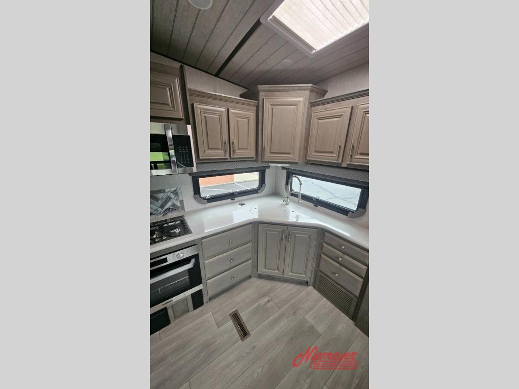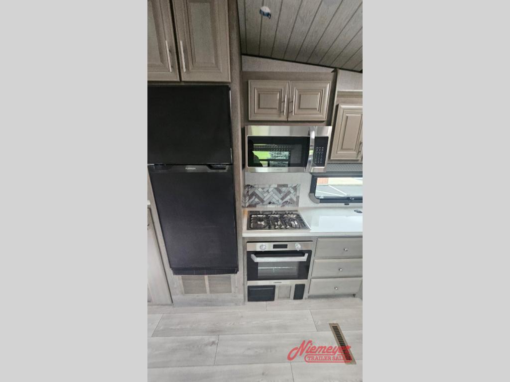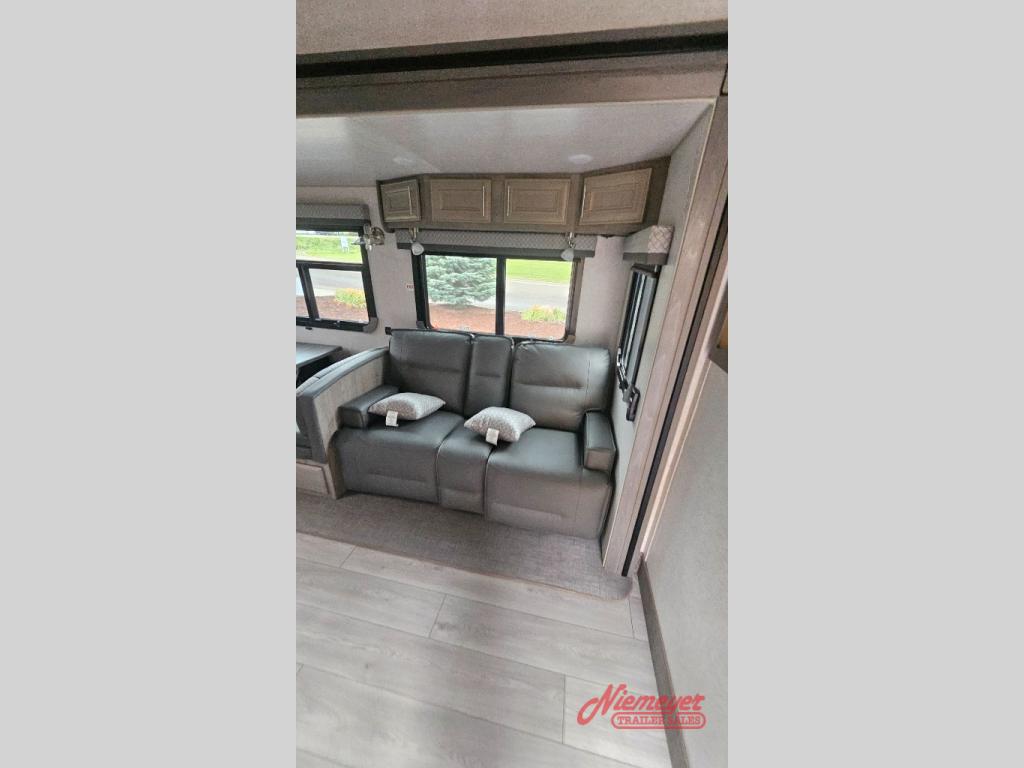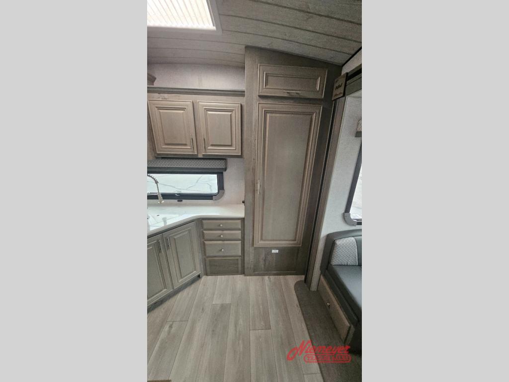The perfect couples fifth wheel is waiting for you! From the front private bedroom with access to the full bathroom, to the spacious living area with a slide out giving you more interior space to relax and unwind, you will find something to love each time you travel. The rear kitchen offers solid surface countertops and a three burner range, and you can dine at the free-standing dinette with four chairs. You might choose to replace the table and chairs with an optional booth Dream dinette instead. There is a 32" LED Smart TV to watch when you are inside, and you will find two pantries so your snacks and ingredients are organized and ready to grab. And you will find ample storage throughout the interior for all your things as well as along the exterior.