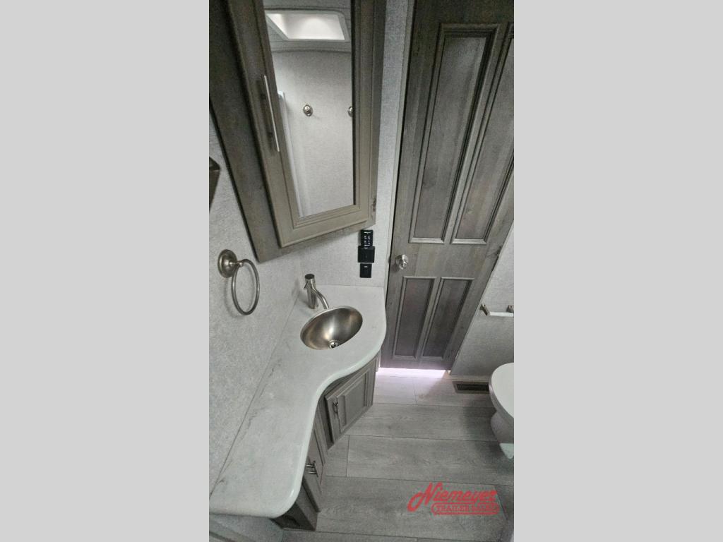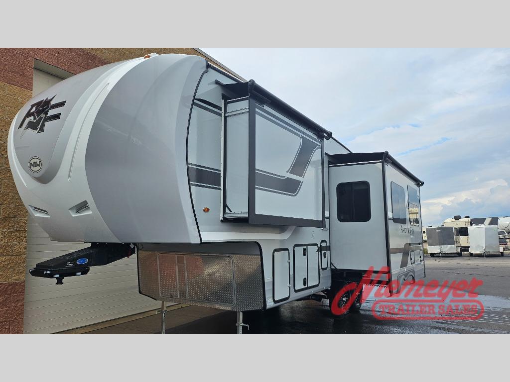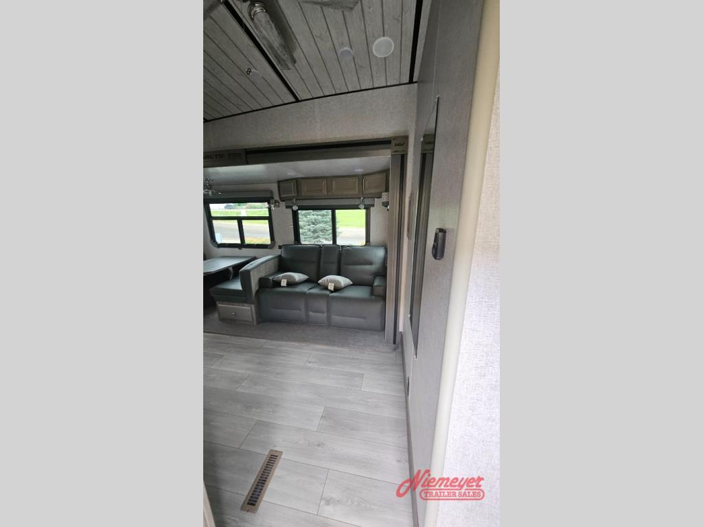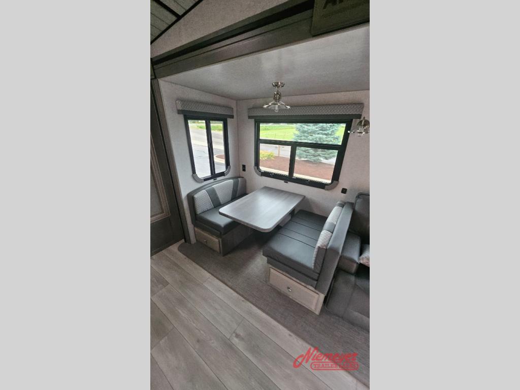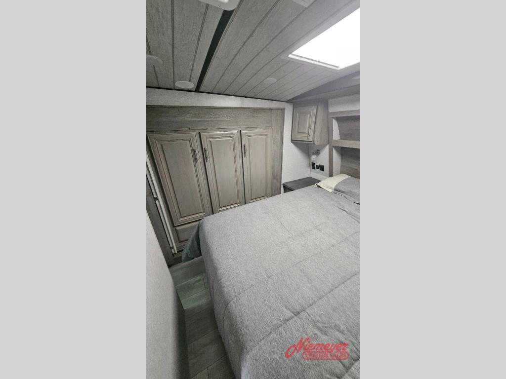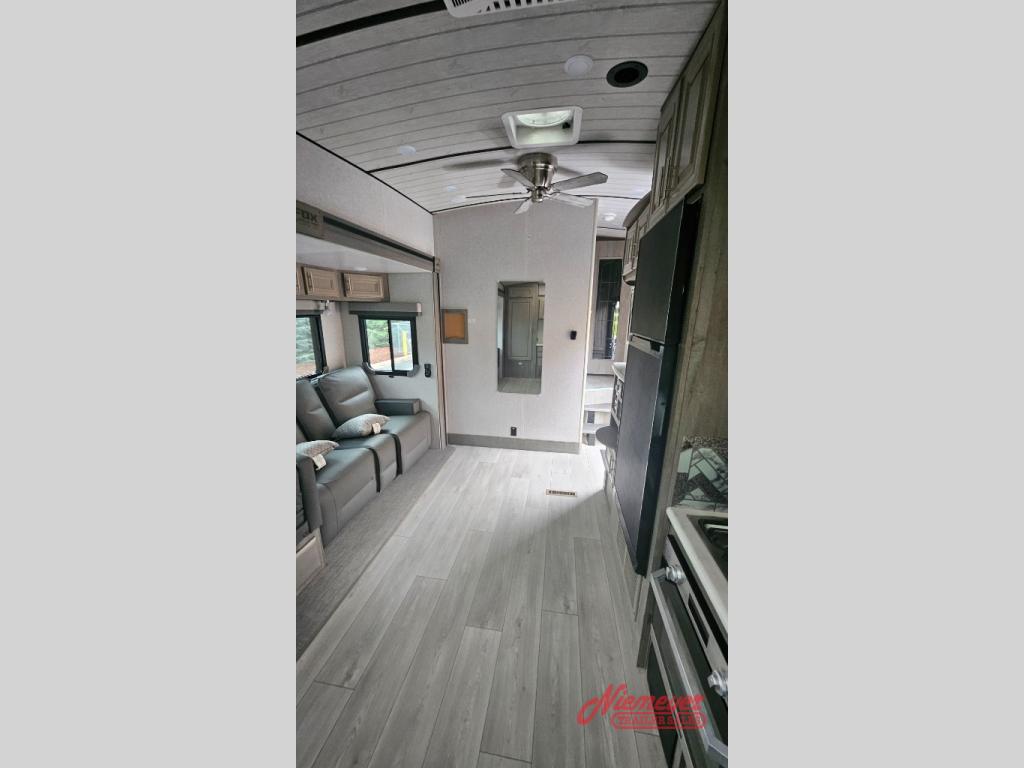 The perfect couples fifth wheel is waiting for you! From the front private bedroom with access to the full bathroom, to the spacious living area with a slide out giving you more interior space to relax and unwind, you will find something to love each time you travel. The rear kitchen offers solid surface countertops and a three burner range, and you can dine at the free-standing dinette with four chairs. You might choose to replace the table and chairs with an optional booth Dream dinette instead. There is a 32" LED Smart TV to watch when you are inside, and you will find two pantries so your snacks and ingredients are organized and ready to grab. And you will find ample storage throughout the interior for all your things as well as along the exterior.