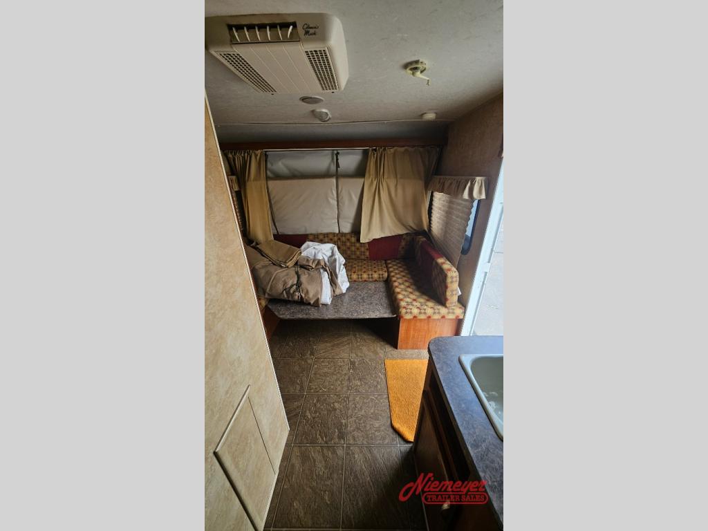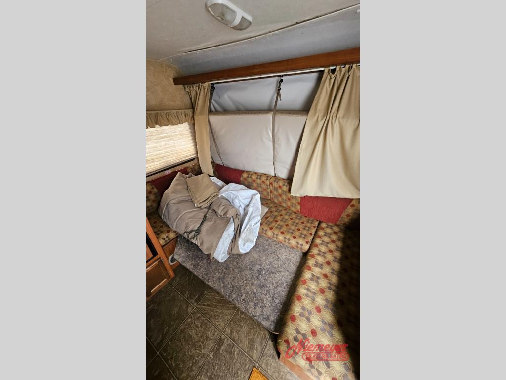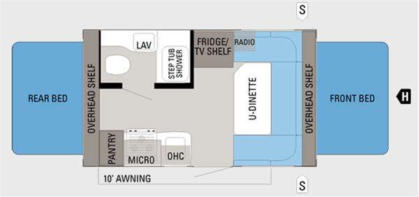 Jay Feather Sport Travel Trailer Expandable by Jayco, Front & Rear Expandable Beds, Overhead Shelf, Rear Bath w/Tub/Shower, Toilet, Lav., Pantry, 3 Burner Range w/Micro., Single Kitchen Sink, Overhead Cab., Refrig./TV Shelf, Radio, U-Shaped Dinette w/Table, Overhead Shelf, Ext. Storage, 10' Awning & More.