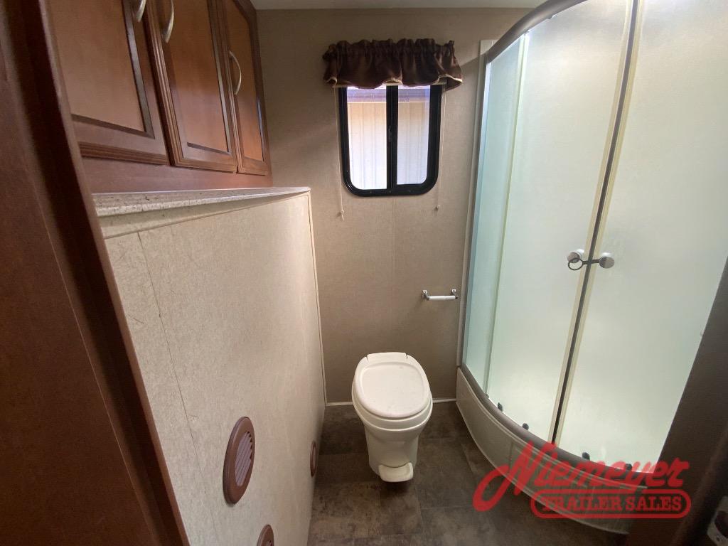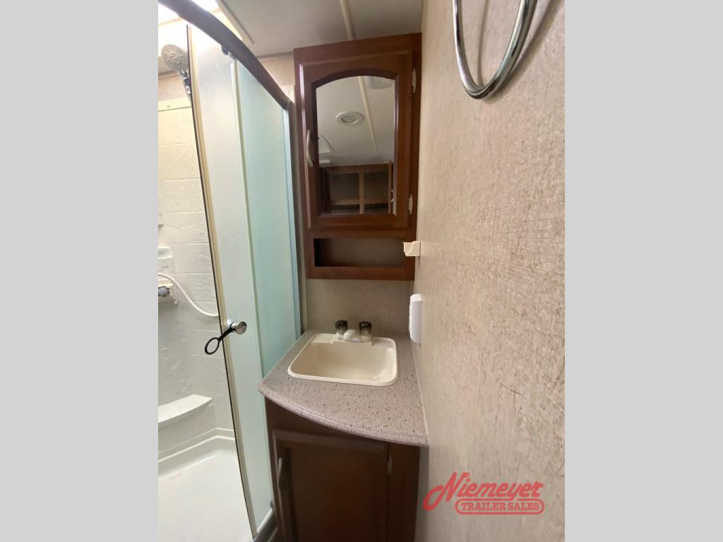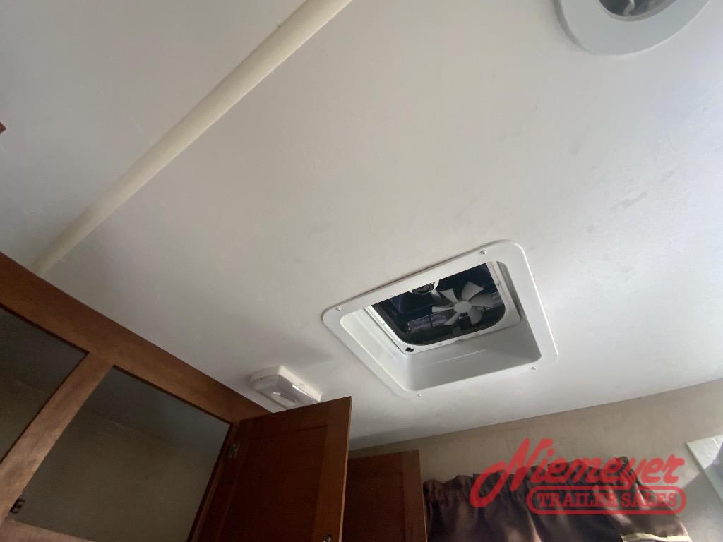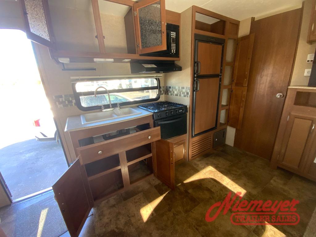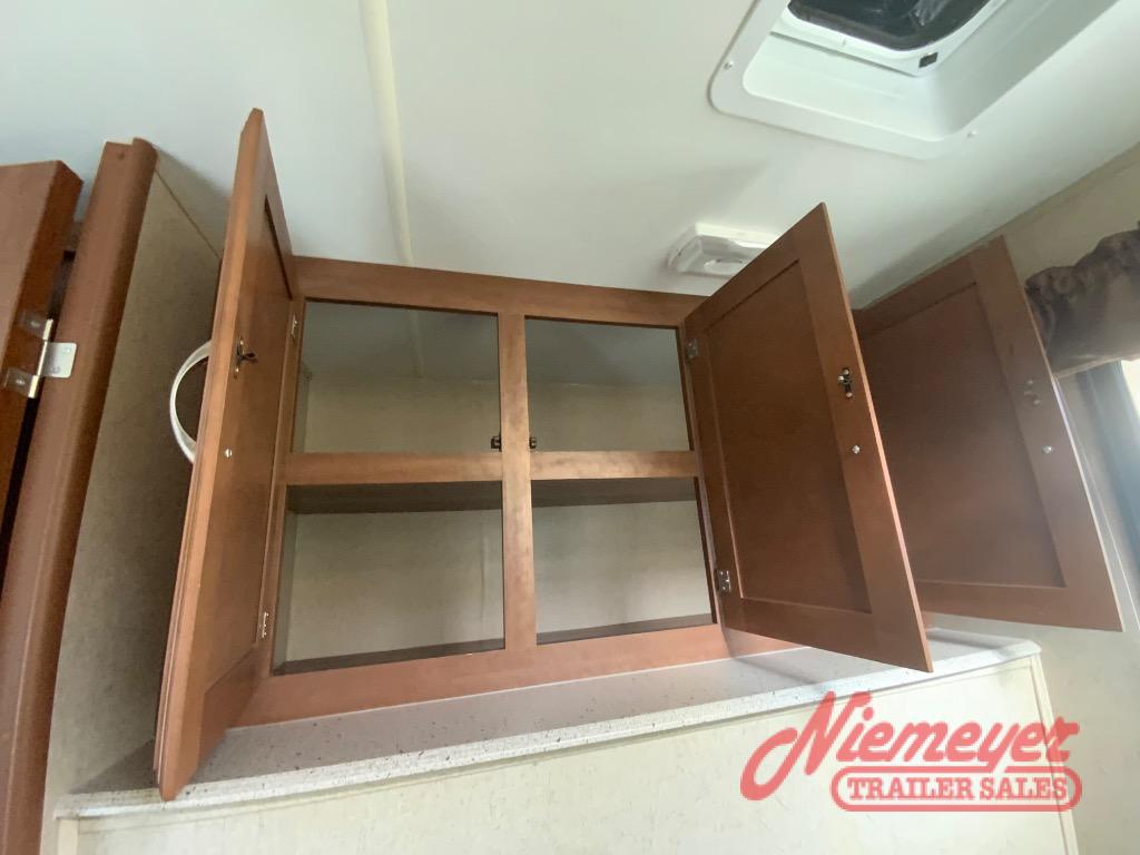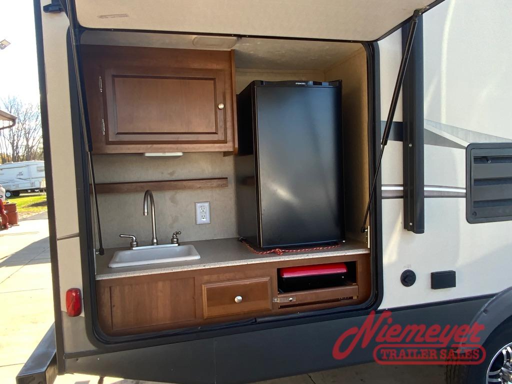 The front exterior pass-through storage compartment features plenty of space for all of your outdoor camping gear. And a rear camp kitchen below the bath linen cabinet is a great feature for those who enjoy cooking and dining outside.