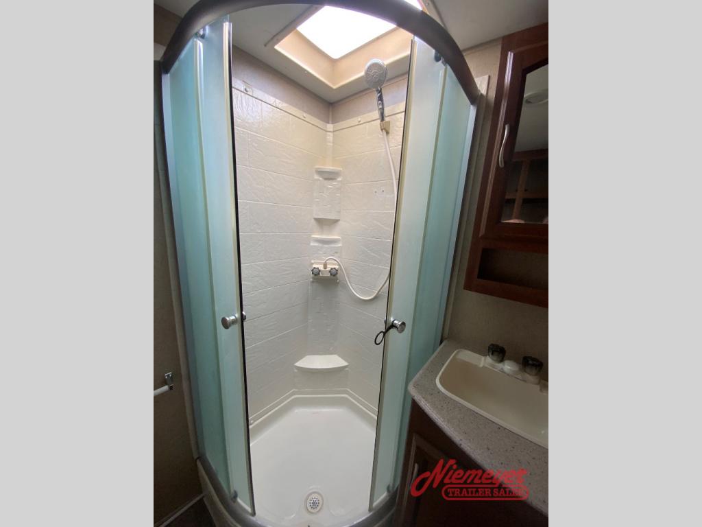 A/C, Microwave, Frigde, 6 gal Water Heater, Flat screen TV, Crank Down Stab Jacks, Outside Shower, White Awning fabric, Spare Tire and DVD player