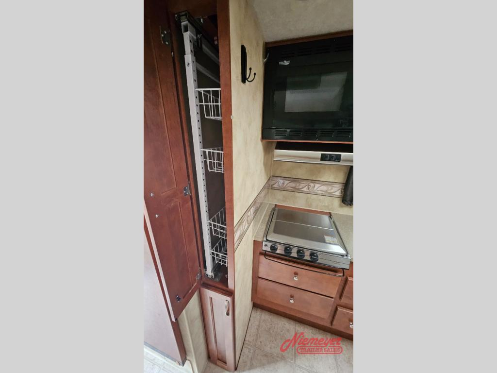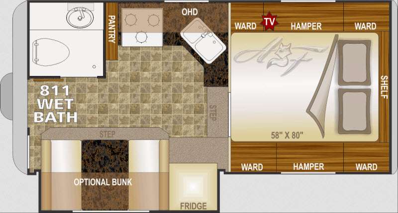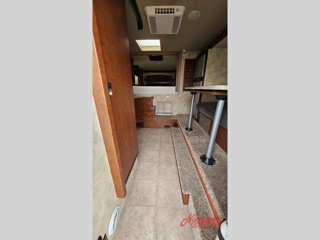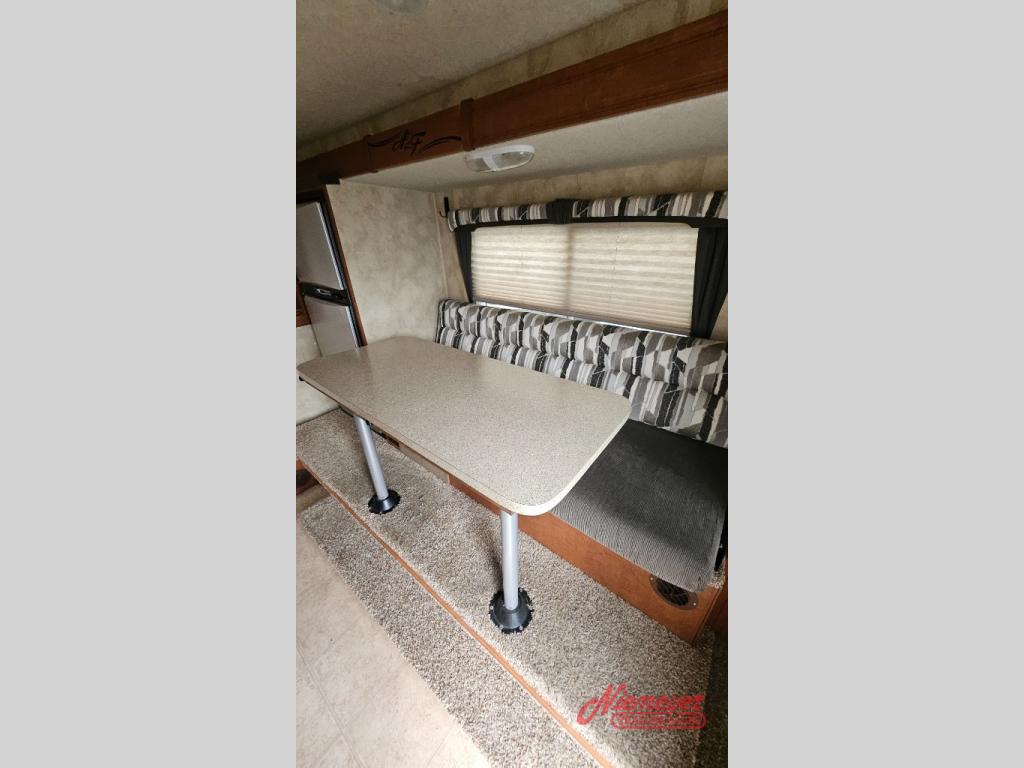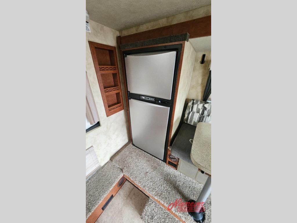 Across, take one step up to the slide out including a booth dinette with an optional overhead bunk and a refrigerator.