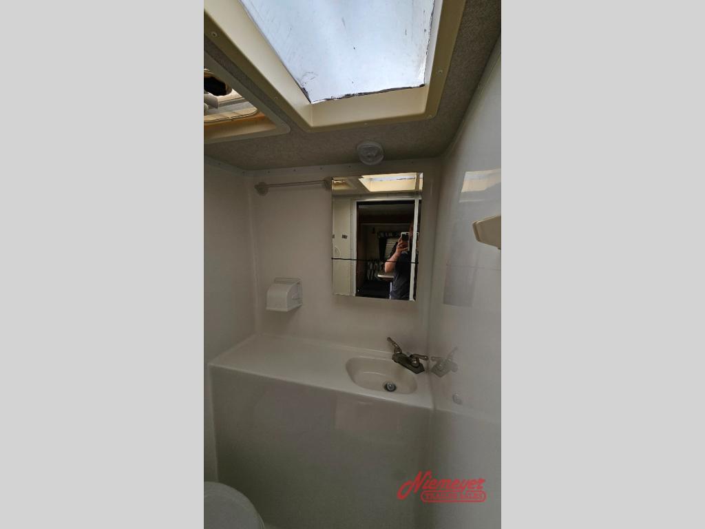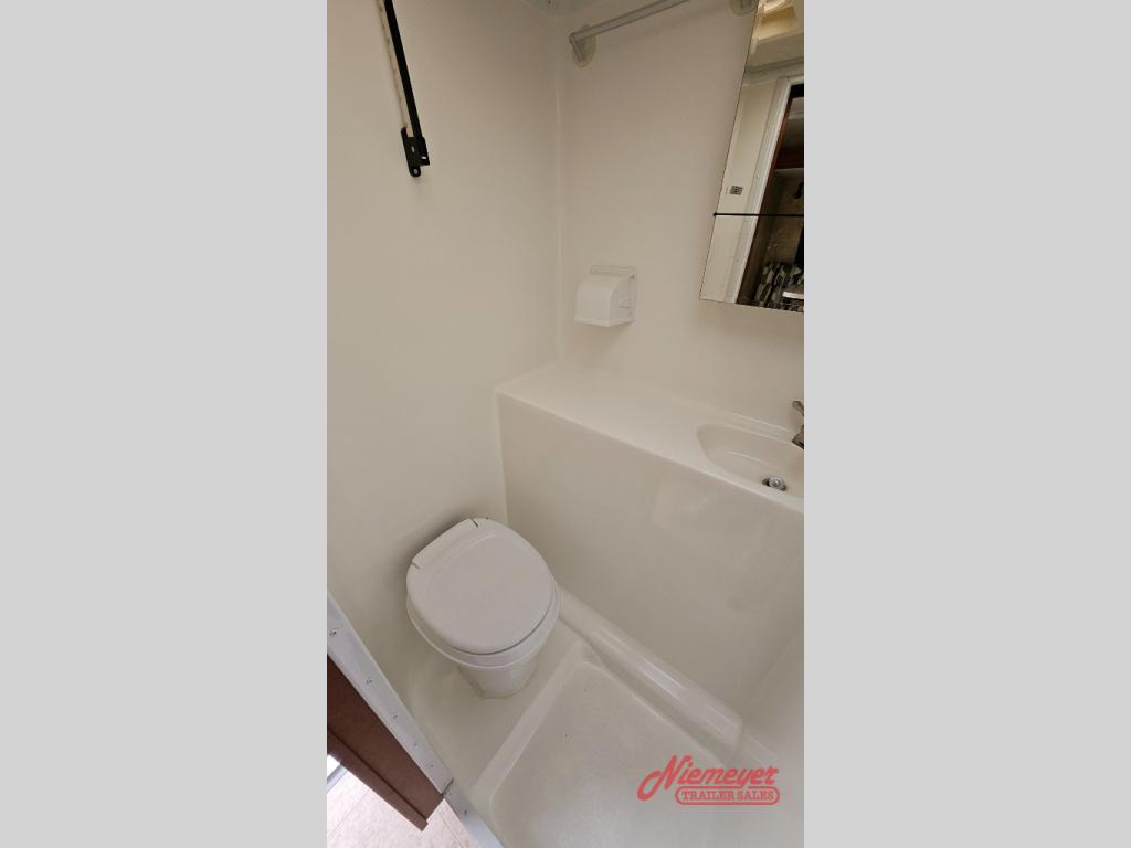 Step into the Arctic Fox Camper 811 Wet Bath by Northwood Mfg. to find a wet bath on your left. It includes a toilet, a sink, and the fiberglass shower stall.