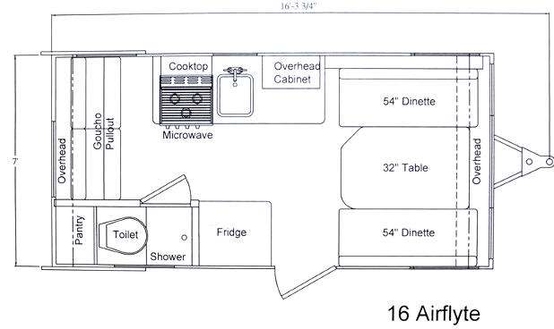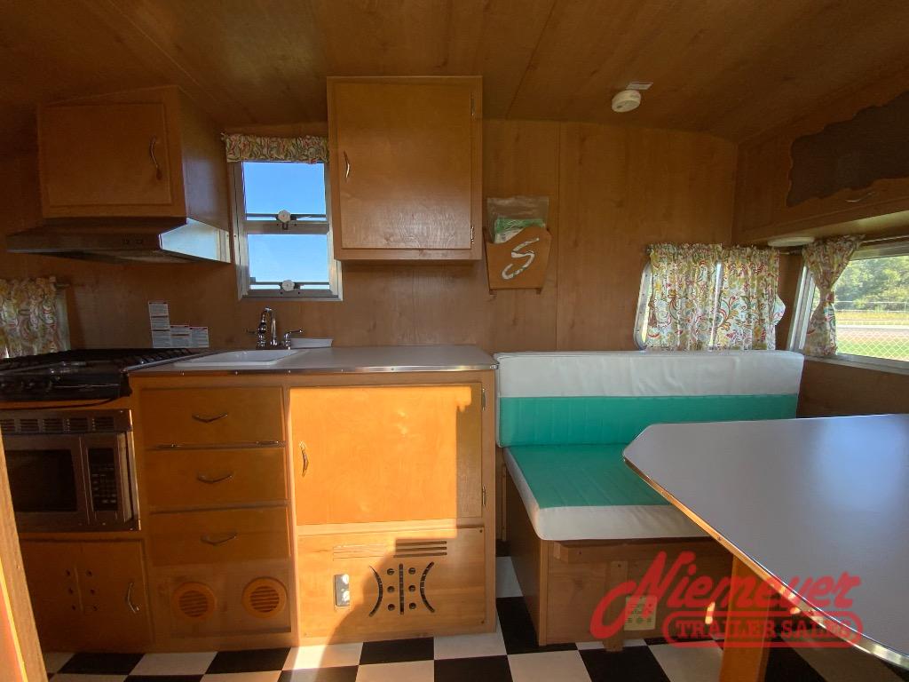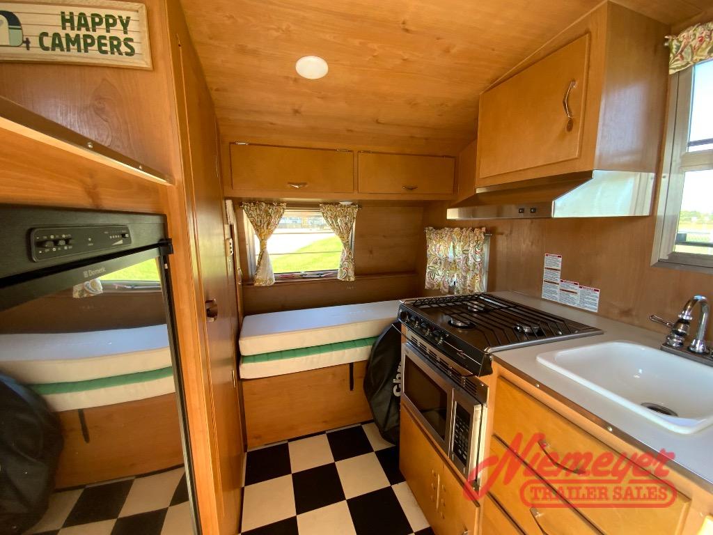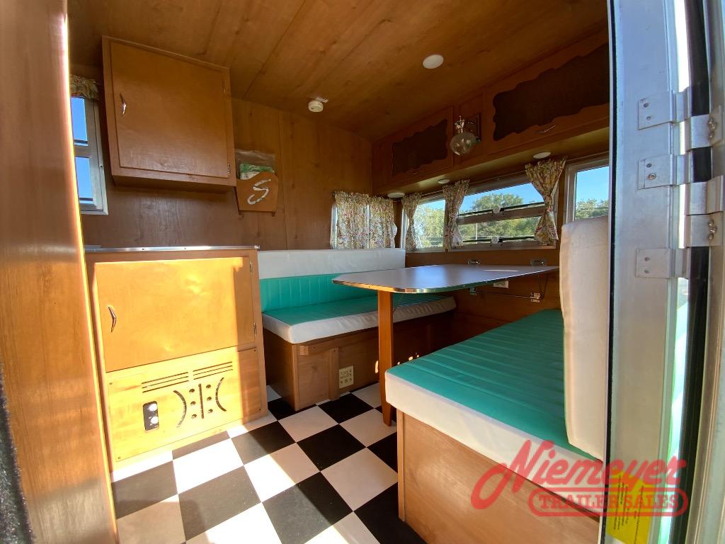 Inside find a 54" dinette in front with overhead cabinets that sport the same detailing. The 32" table folds down at night to easily make into a sleeping space for two.