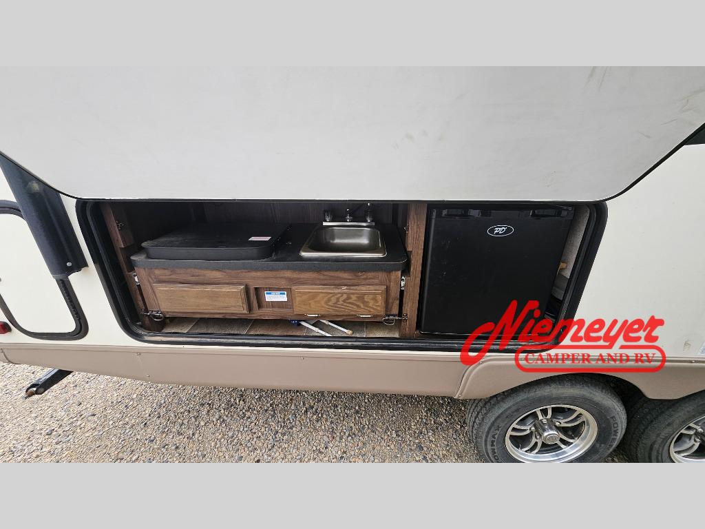 Outside fix a quick snack or dinner at the pull-out kitchen which features a two burner range, sink, and refrigerator. You will also find an optional gas grill, and an optional rear ladder. Your exterior camping gear can be stored in the exterior storage area and more!