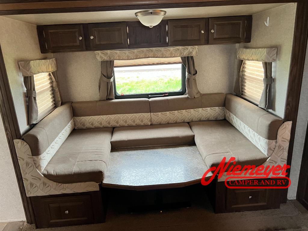 Step inside and find a refrigerator to the left, and on the wall outside of the bathroom there is an entertainment center which can easily be seen from the kitchen area. to the right of the entry door find a three burner range, microwave, double kitchen sink, large counter area with overhead cabinets, and a pantry. The u-dinette is on a slide and there is an overhead cabinet.