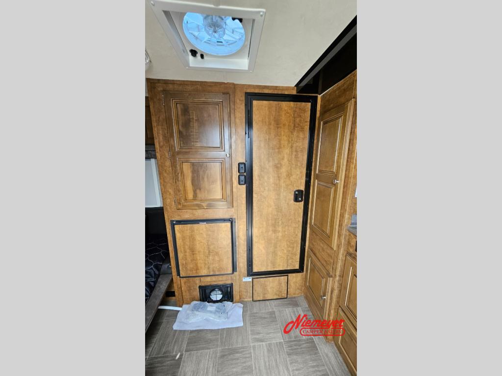 The front corner wet bath offers a toilet and shower, and there is storage just outside the bathroom next to the dinette/bed, plus so much more!