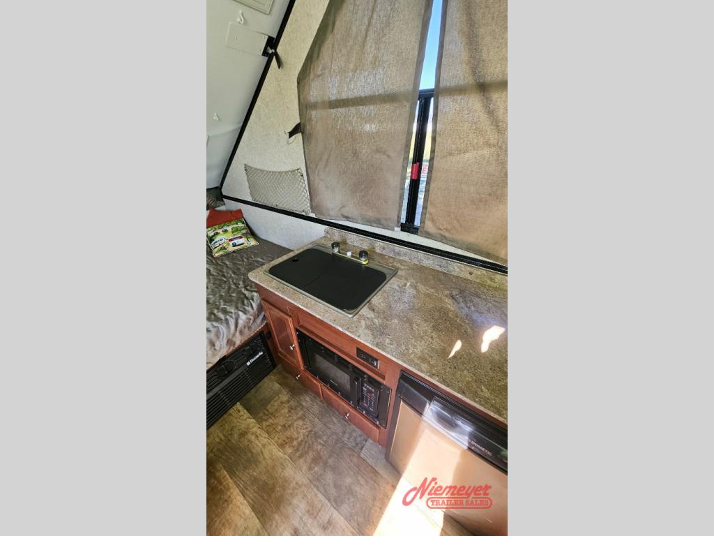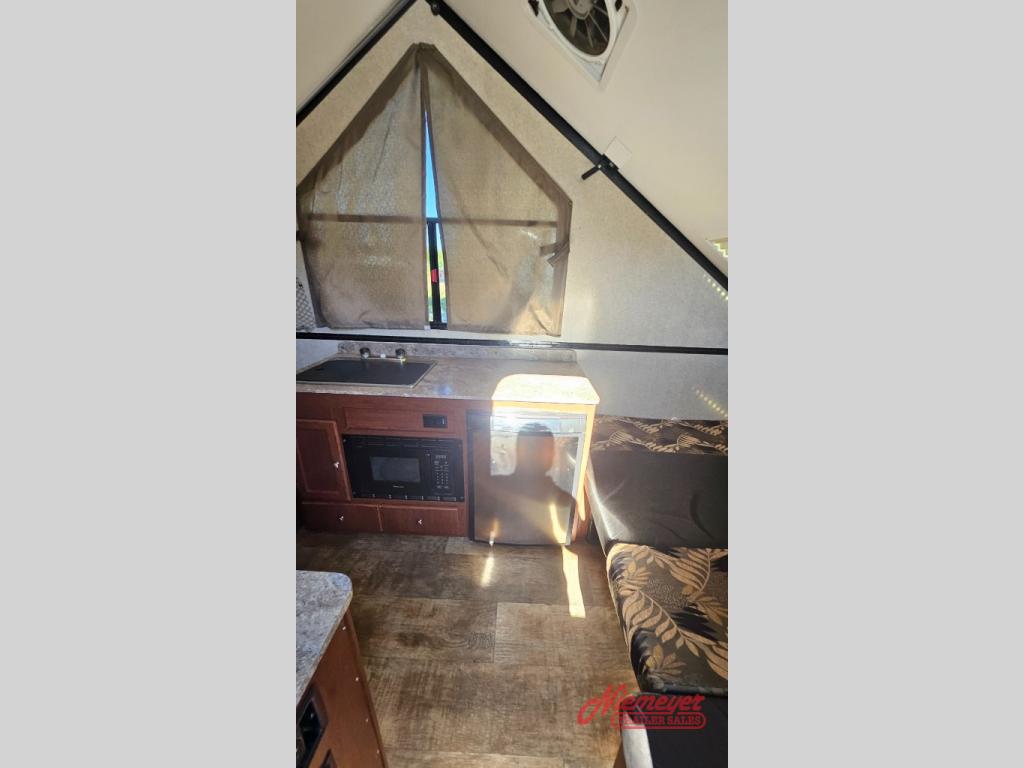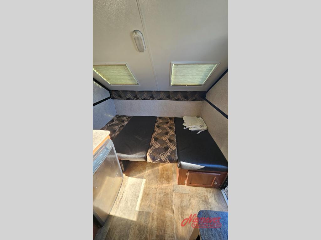 As you enter this Rockwood Hard Side High Wall Series A212HW folding pop-up camper by Forest River, you will find that there is a 50" x 80" front booth dinette. The dinette folds down to provide sleeping space for TWO if you like.