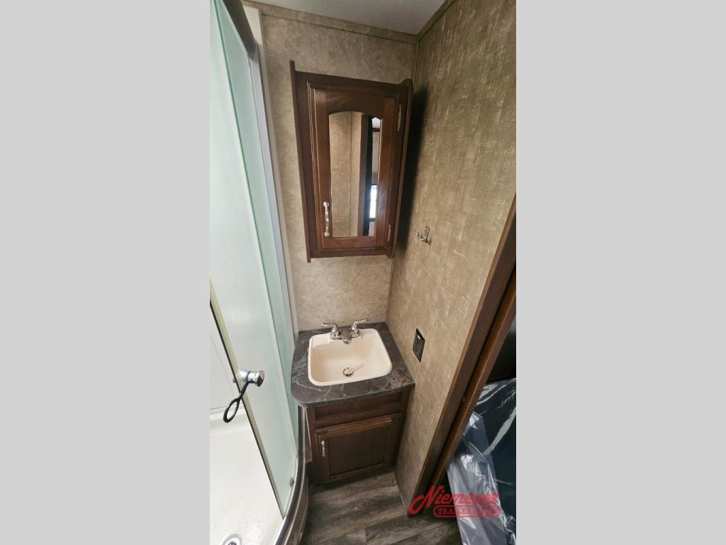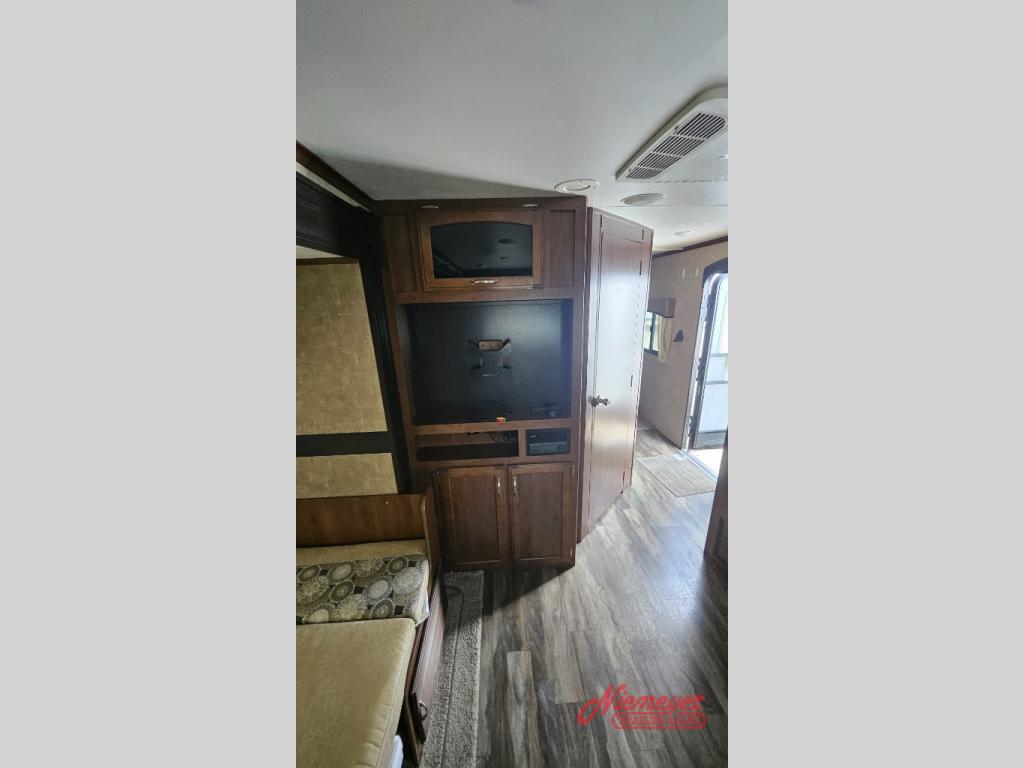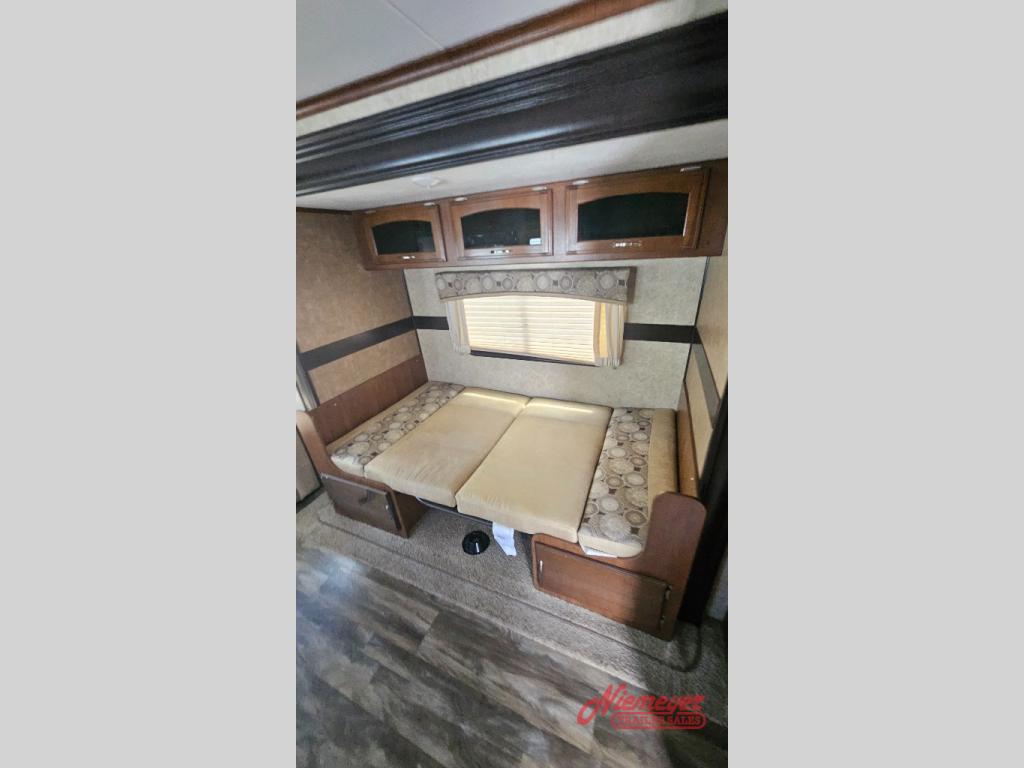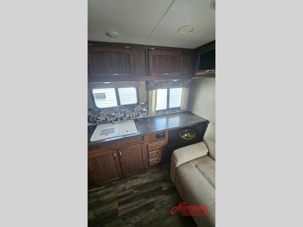 The kitchen space on the curb side includes a refrigerator, three burner range with overhead microwave oven, a large kitchen sink, and a large amount of countertop space that stretches to the rear of the trailer. There are also overhead cabinets for storing your dishes and pots and pans over the sink and countertop. The dinette slide with overhead cabinets is on the opposite side allowing more space to move around. A entertainment center is on the interior wall right next the dinette. The rear living space features a jackknife sofa with overhead storage.