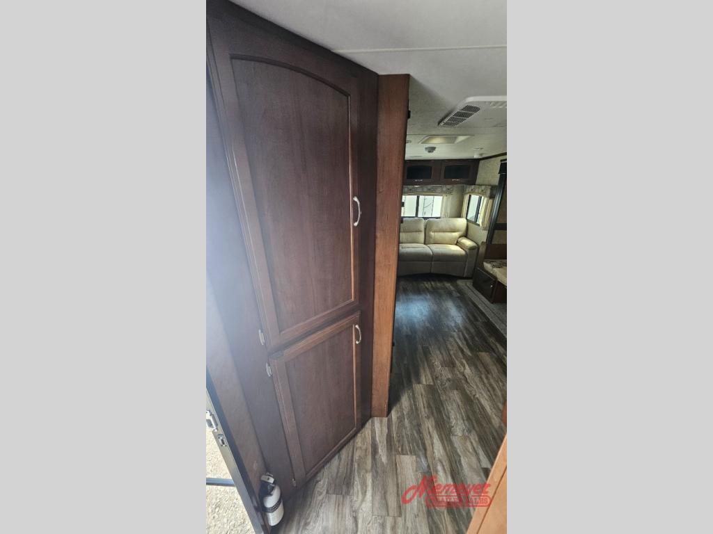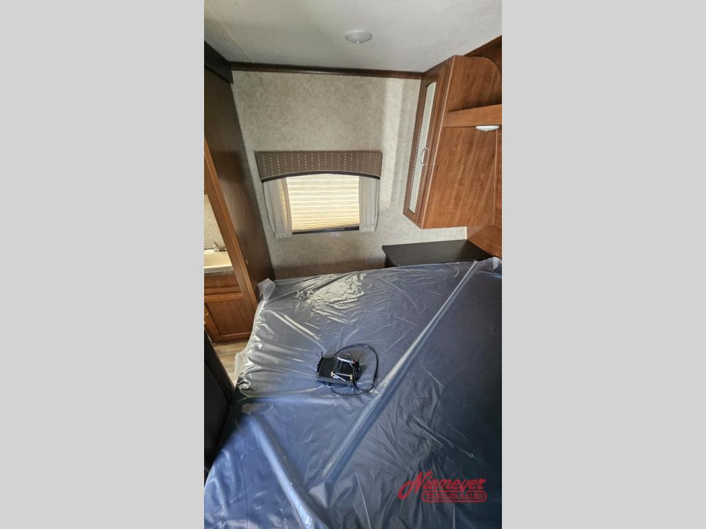 As you enter the trailer to the right a curtain separates the front bedroom from the hallway to the living/kitchen space. There is a queen bed, wardrobes on each side of the bed, and an overhead shelf. A sliding bathroom door allows direct access to the the bath from the bedroom.