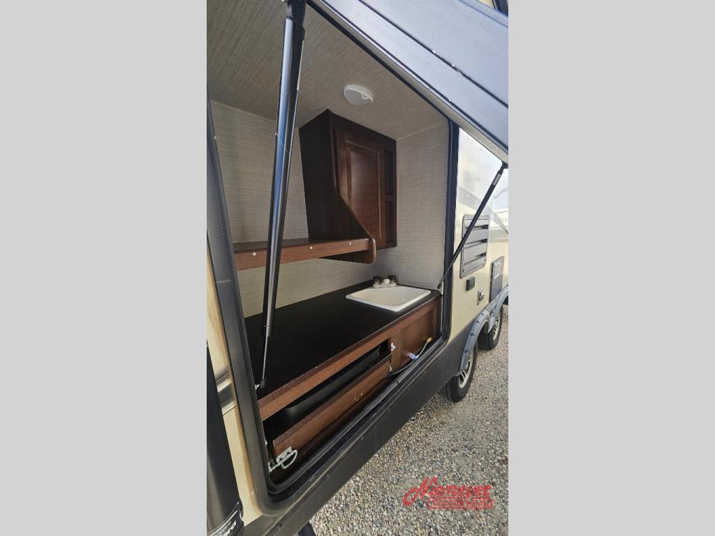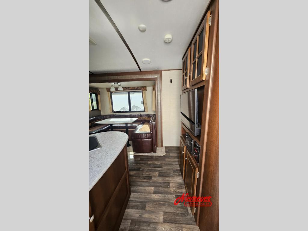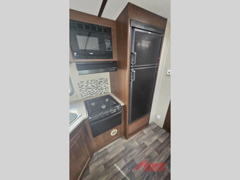 Outside enjoy the pass through storage compartment up front for all of your exterior camping gear and more. There is an outdoor kitchen that features a refrigerator, sink, and two burner cooktop, plus so much more!
