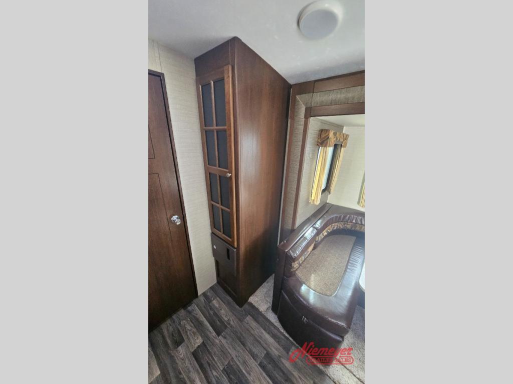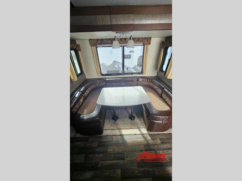 There is a u-shaped dinette slide across from the Premier kitchen which features a double sink, three burner range, and refrigerator. There is also a pantry just off to the side of the dinette for more storage.