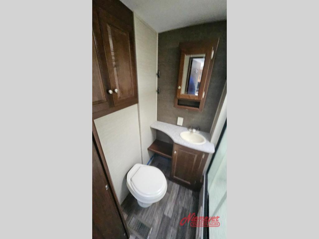 The rear bath provides a 30" x 36" shower with glass door, vanity with sink and toilet. There is also a linen cabinet next to the toilet for storage.