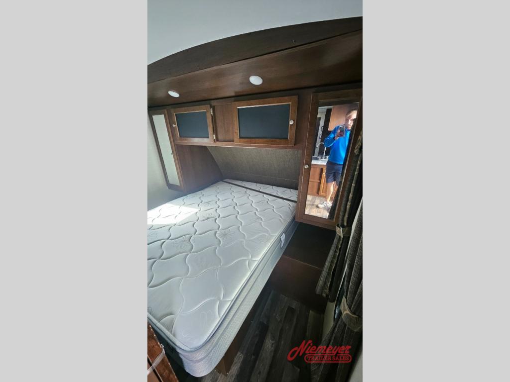 Step inside near the front bedroom to find a queen size bed. There are wardrobes on both sides of the bed, an overhead cabinet, and a convenient laundry chute.