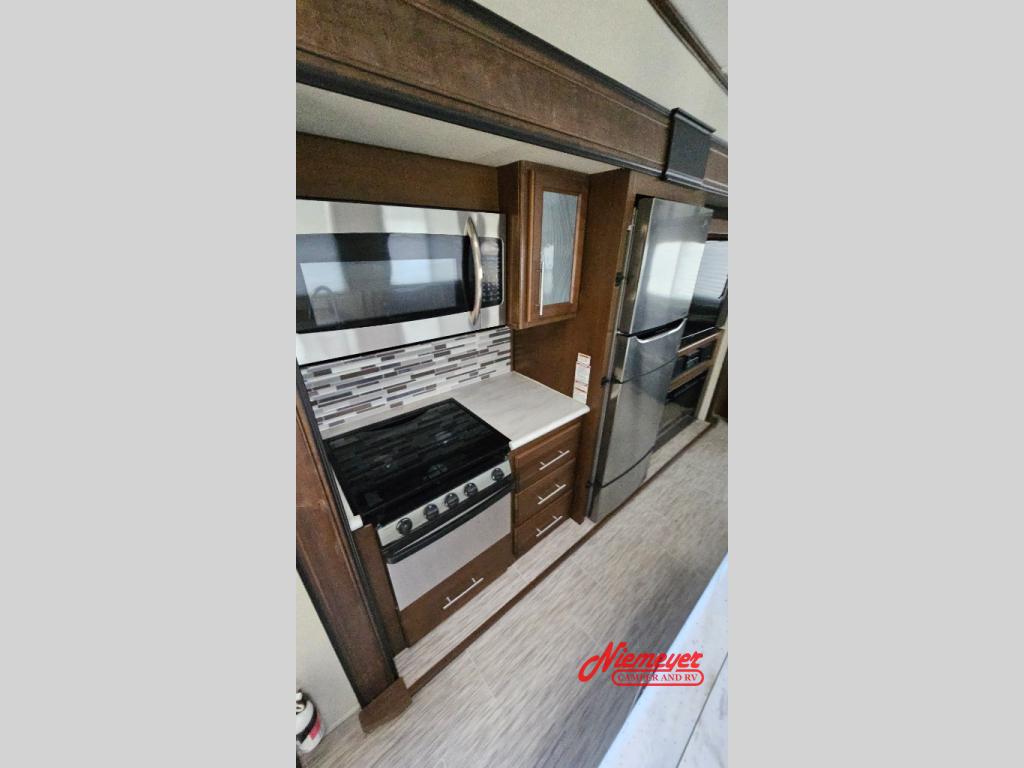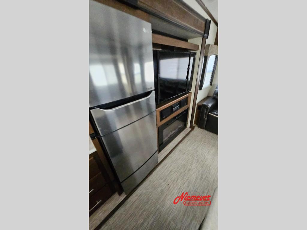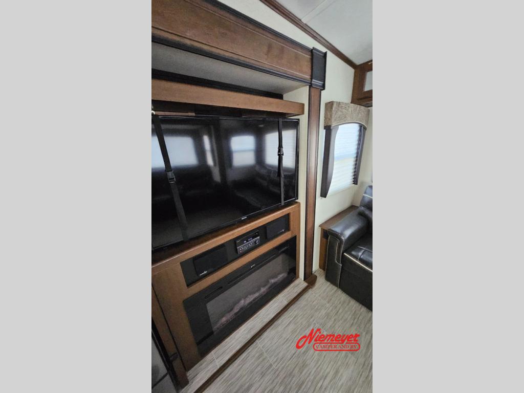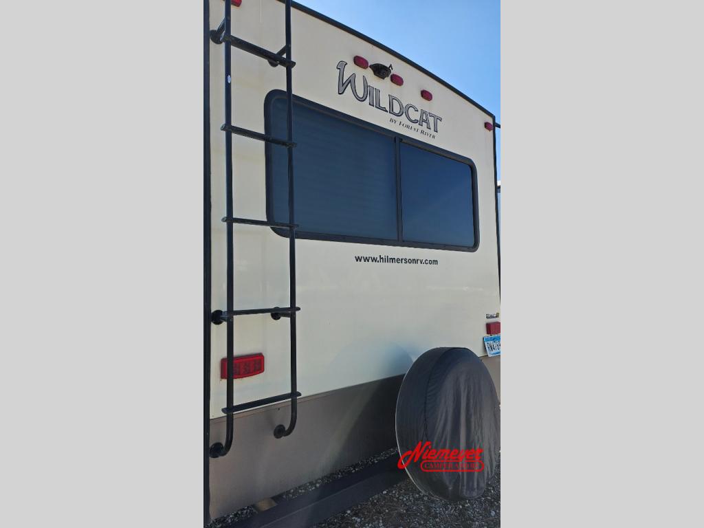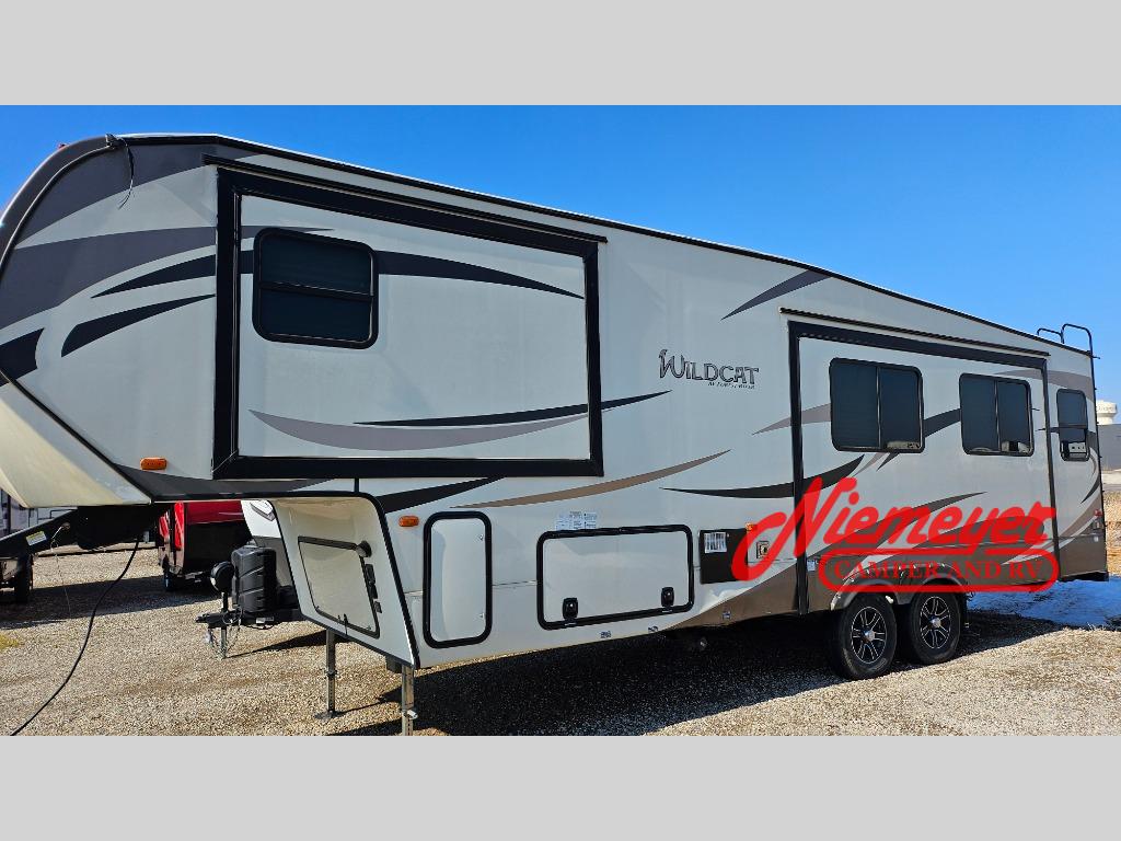 If you are looking for a modern and elegant unit that will not only look stylish, but will also meet all of your traveling needs, then you need this Wildcat fifth wheel. Because of its ability to sleep five people, this unit creates the perfect environment for weekend family getaways, and the front, private bedroom allows you to have a separate space in order to recharge and refresh for the adventures to come. You and your family will love spending evenings together in the living area because of the open feeling that three slides give this trailer, and the electric fireplace provides a cozy atmosphere for you to relax in.