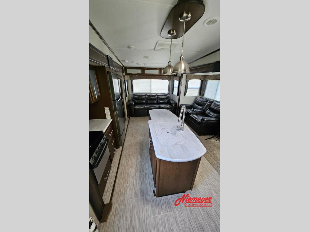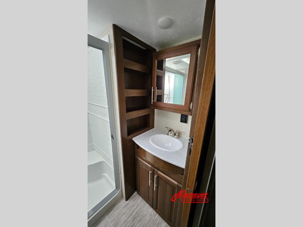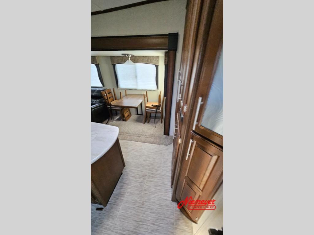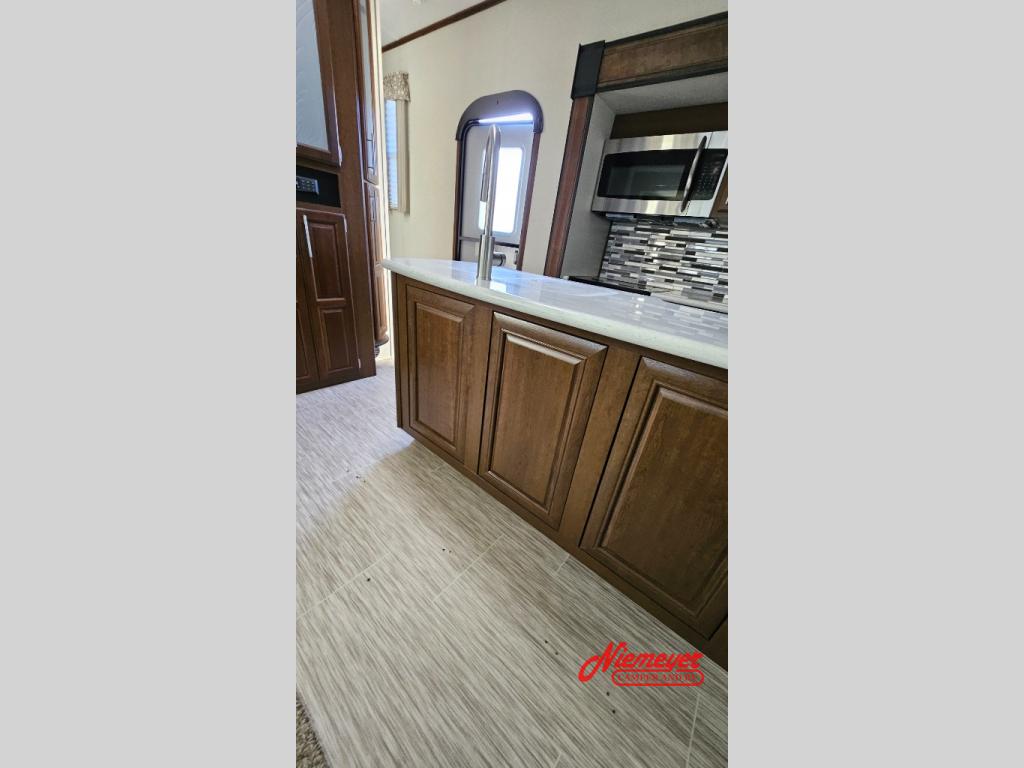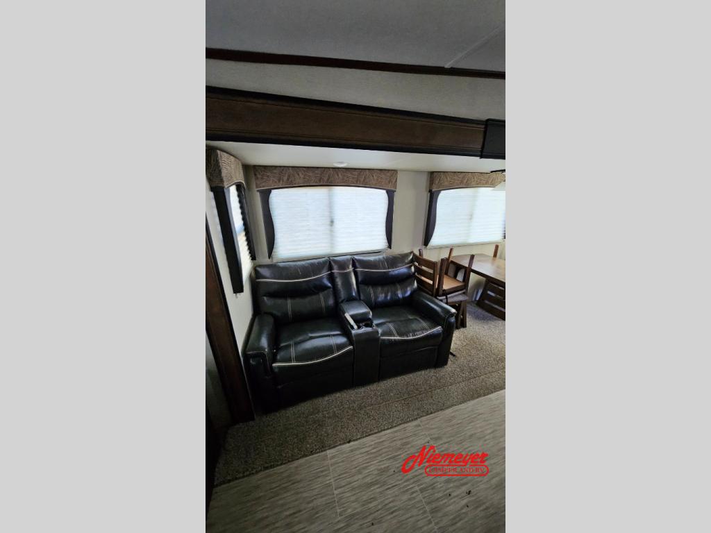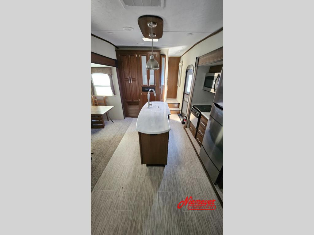 If you are looking for a modern and elegant unit that will not only look stylish, but will also meet all of your traveling needs, then you need this Wildcat fifth wheel. Because of its ability to sleep five people, this unit creates the perfect environment for weekend family getaways, and the front, private bedroom allows you to have a separate space in order to recharge and refresh for the adventures to come. You and your family will love spending evenings together in the living area because of the open feeling that three slides give this trailer, and the electric fireplace provides a cozy atmosphere for you to relax in.