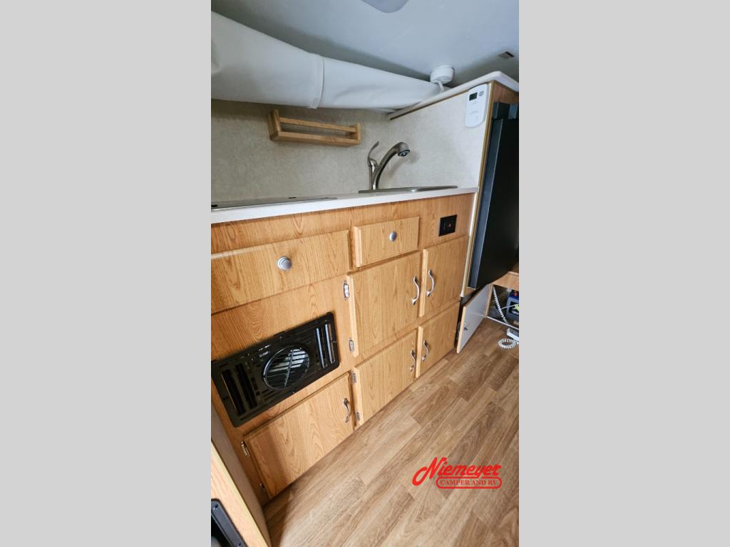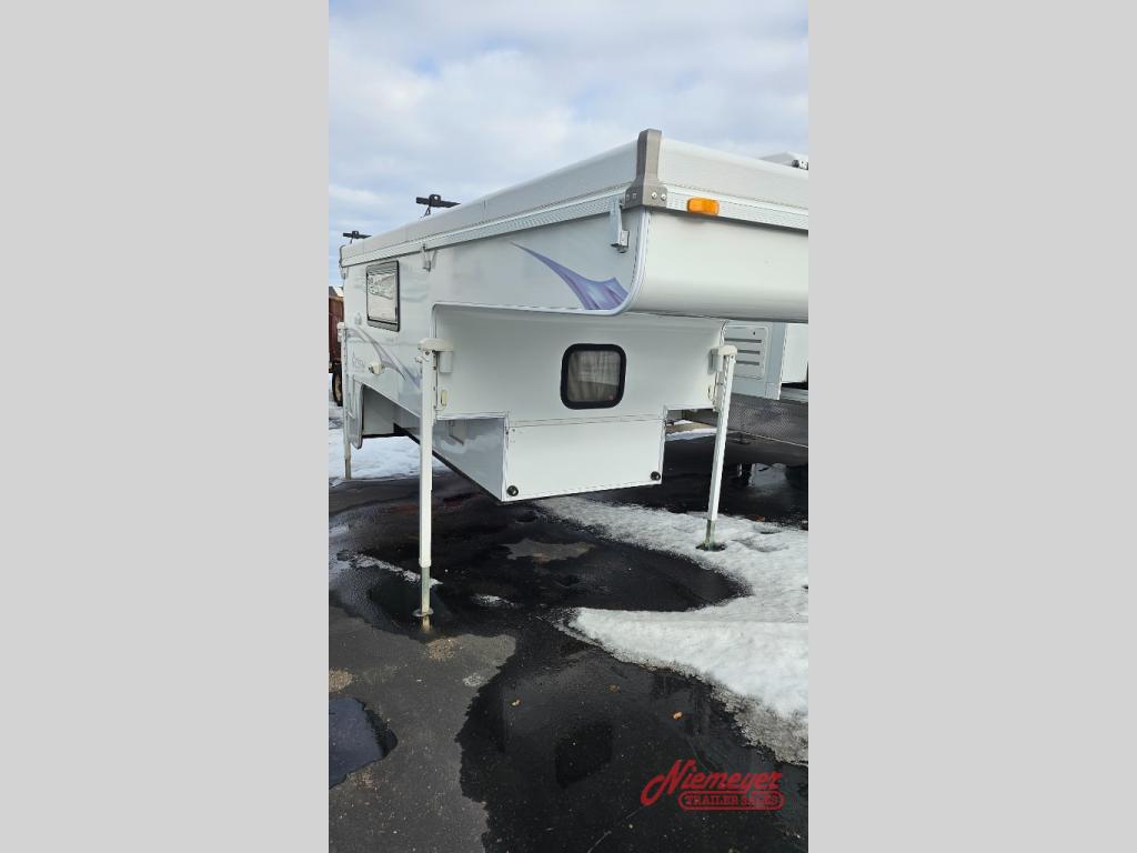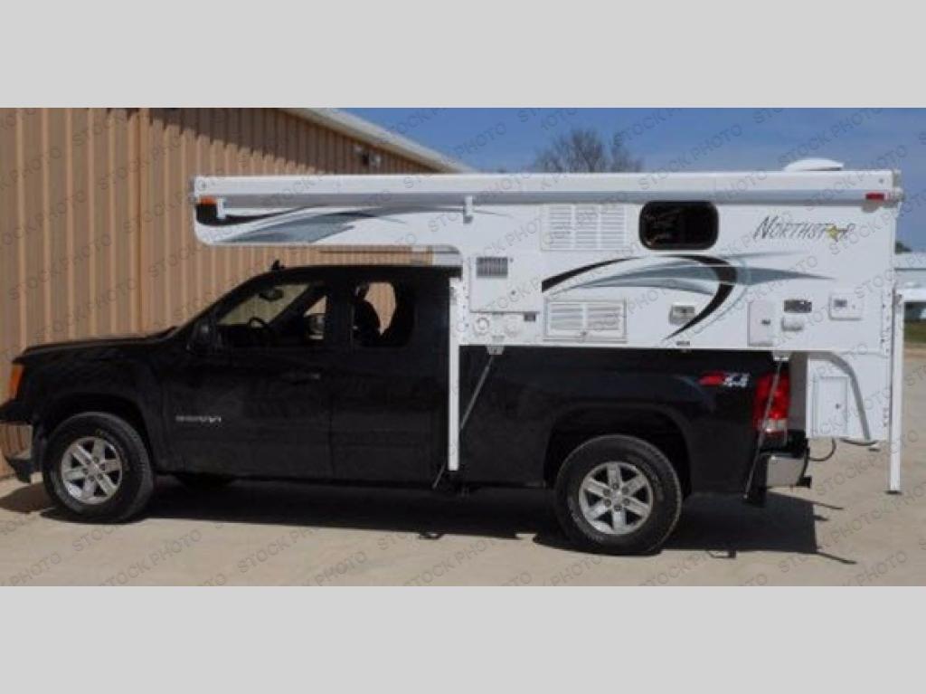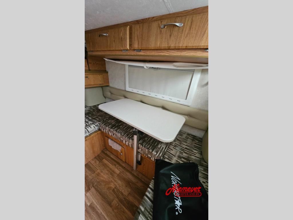 This Northstar Pop-Up 850SC truck camper will easily fit on short (6'4" to 6'10") or a long bed (8') truck. This model features a u-dinette where you can enjoy your meals. Stepping inside the camper, to the right there is a shower and cassette toilet. Just past the bath area you will find a u-dinette. Along the opposite side of the camper there is a wardrobe, two burner range, sink, and refrigerator.