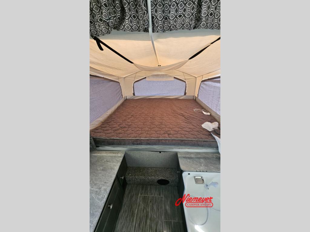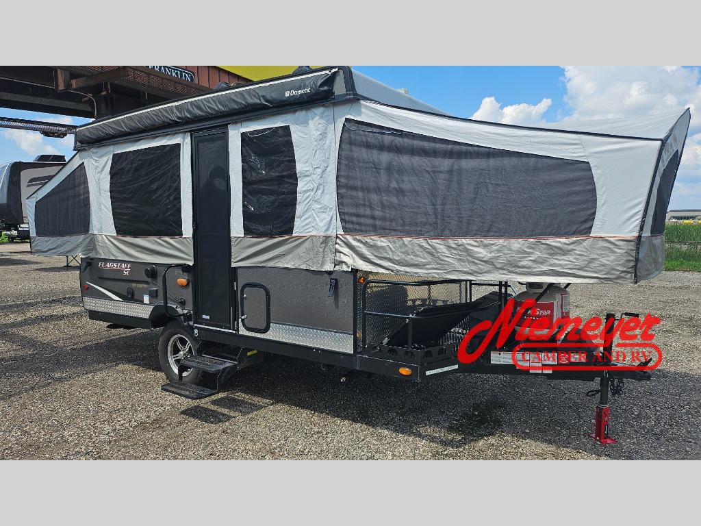Easily load up your toys and gear on the front deck storage with expandable metal decking and hit the road with this Flagstaff SE folding pop-up camper. This unit features a front king tent end bed and a rear queen tent end bed for a comfy night's rest after a long day. You'll be pleased with the drop leaf table at the 36" x 69" dinette where you can gather around and enjoy your meal or maybe a game or two. Meal prep and clean up is a breeze with a swing galley, a 1.9 cubic foot refrigerator, and a three-burner range. This unit also features the Hot Water Package which includes a water filter, an outside shower, a six-gallon DSI hot water heater, and a demand water pump.