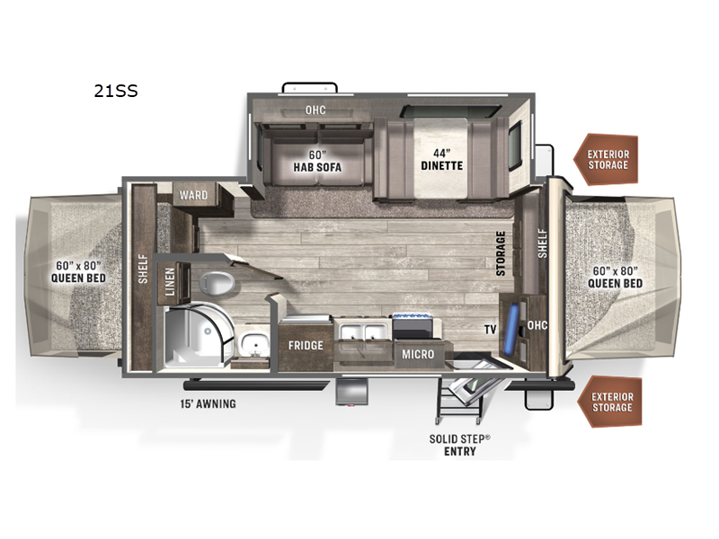Every camping trip can be spent in comfort with this spacious expandable! Within the large slide you'll find the 44" booth dinette and 60" sofa for comfortable seating and sleeping space, and check out the LED TV! Use the three burner gas cooktop or the exterior griddle to prepare lunch on before you all head out for the day. The full bath includes the Showermiser water saving system you are sure to appreciate, plus a linen closet for clean towels. This model also includes two queen tent end beds for your comfort!