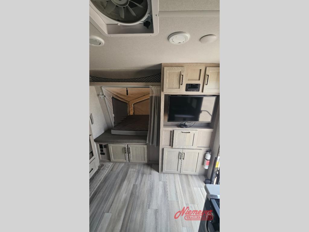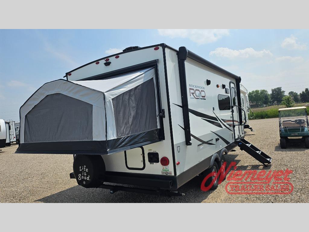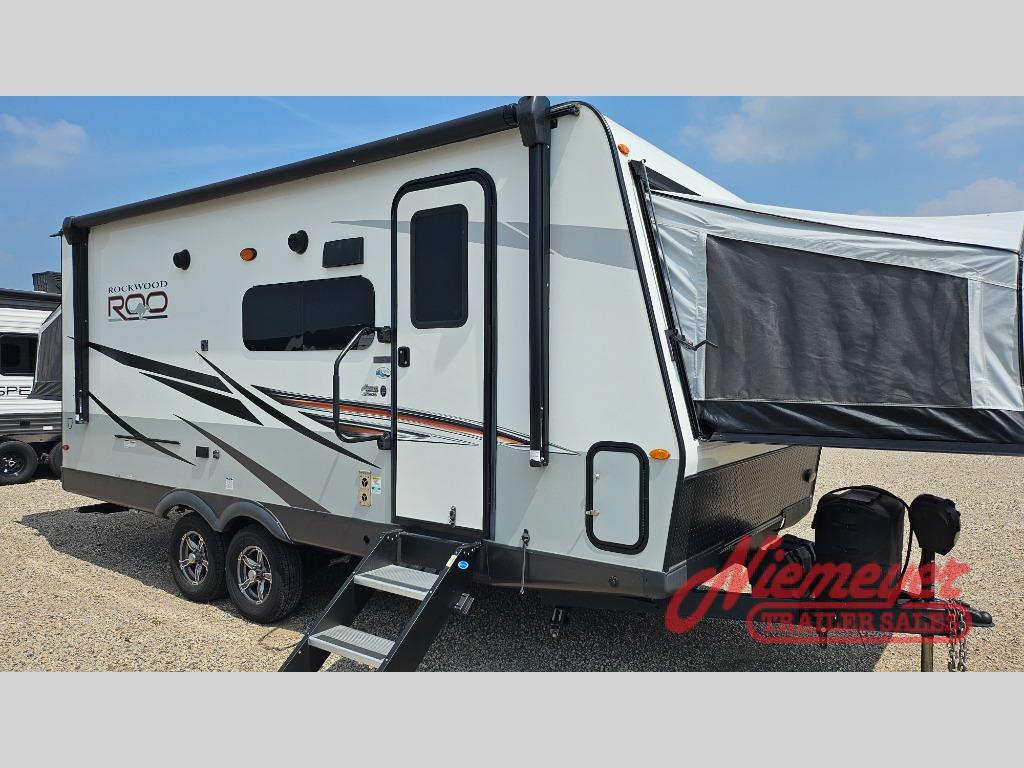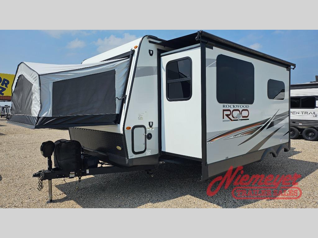 With any Rockwood Roo expandable travel trailer by Forest River you will enjoy smooth towing thanks to the torsion axle, Rubber-Ryde suspension, the easy lube axles and Nev-R-Adjust brakes, and the Goodyear Endurance tires. The key-Alike locks provide easy access in and out of your trailer, and each model includes a Teton all-in-one WiFi booster with LTE prep and an antenna for all your connection needs. Each model is constructed with a vacuum laminated one-piece roof and walls, an enclosed underbelly, and frameless windows for a more sleek look. You will enjoy many interior comforts, including hardwood cabinet doors and drawer fronts, pleated night shades, a bunk/fan light combo with each bed, and much more!