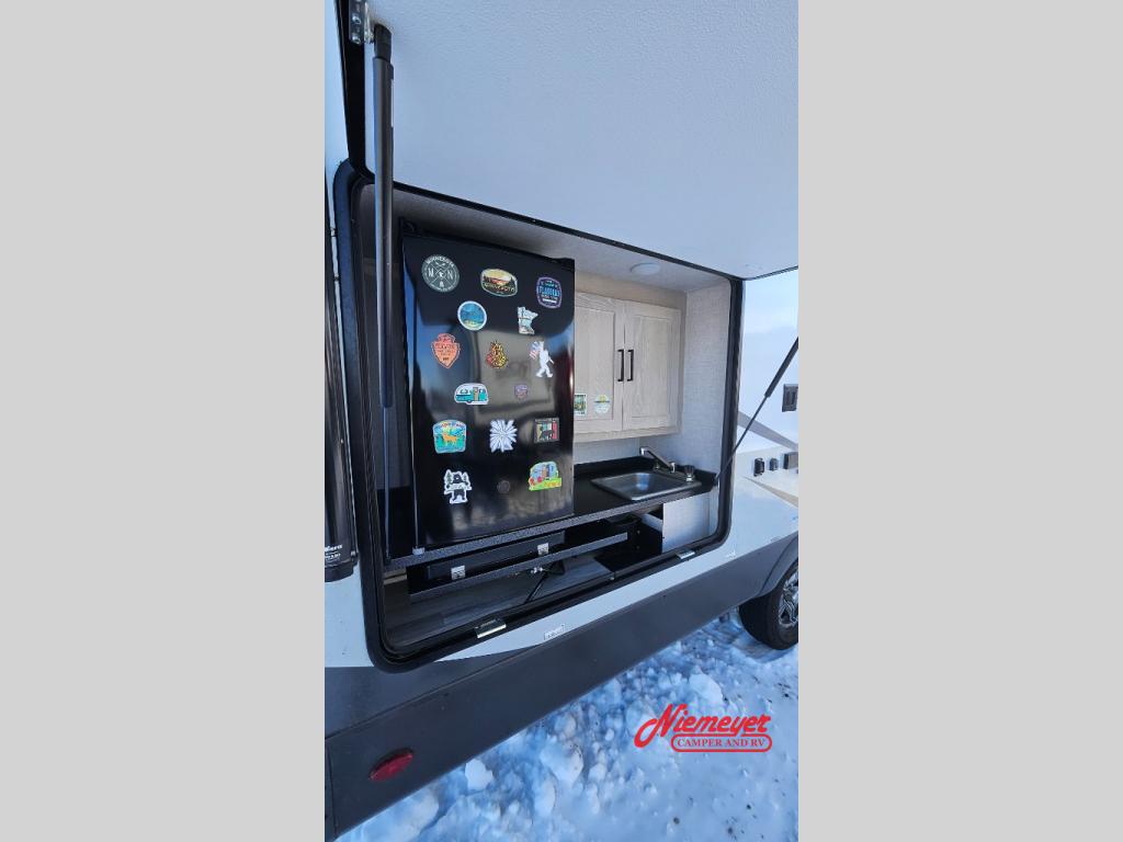 This is the perfect travel trailer for two people looking for comfortable camping trips! You will have your own RV queen bed to sleep on in the front private bedroom, and an optional TV can be added if you enjoy the morning news in bed. Breakfast can be made on the three burner cooktop, or head outdoors to cook on the outside kitchen. The theater seating with a table will provide a place to relax and dine together, and the spacious full rear bath will allow you to clean up before you head out for the day. This model includes plenty of storage space, including two pantries, a wardrobe slide out in the bedroom, plus a drop-frame pass-through storage for larger camp gear!